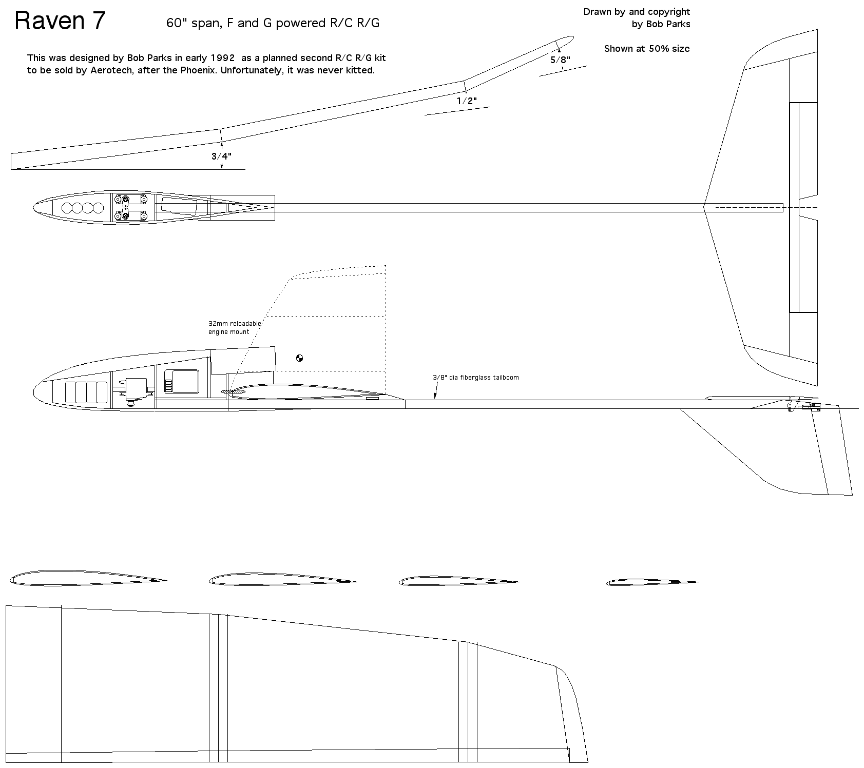 | Bob Parks designed the "Raven" R/C R/G for the 1983 WSMC in Poland. It was the first R/C R/G to be designed for the Aerotech E6 engine, which Bob had worked with Gary Rosenfield to develop. Bob and his wife Karen Dillon flew Ravens, Karen taking the Bronze medal at the 1983 WSMC (Phil Barnes using a Dark Star-5 to win the gold), and the US team had the top team score. Bob shared the plans with others. Ben Roberto made his own series of Raven models. At right is an overview plan of one of Ben's Raven models.
