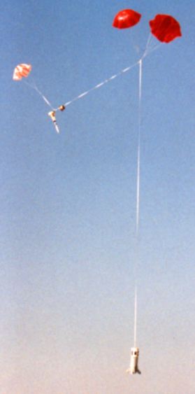 Chute size is a judgment call. The larger the chute (or chutes), the softer the landing...unless it's so big that it gets jammed inside and the model crashes! Smaller chutes cause harder landings, but are more reliable. Experiment with packing chutes in the tube you're using. If you are not able to blow the chute out using lung power, go to a smaller chute or try a different way to pack the chute. And when it comes time to fly, remember to pack the chute the same way! Consider using more than one chute, it may be easier to fit in two smaller chutes than one larger one, and if only one of those two opens the model won't crash. At right is a photo of a Little Joe II model using several parachutes and a very long shock cord. Two main chutes, plus a third smaller one for the nose section. They are all linked together. The model had limited chute srorage space. So the main chutes were packed inside first, and the nose chute packed in last, so it would be the first to some out at ejection. So, if the mains were not ejected out of the main body, the nose cone's chute would act like a drogue chute to yank out the mains. This "semi-drogue" parachute arrangement (everything linked, nose section chute packed to easily come out first at ejection) is very reliable. The method was inspired by some scale models that come down in separate pieces, only to sometimes have the main body's chute jam in the tube and plummet to the ground - with the nose section gently descending by itself, almost mocking the fate of the crashed main body. |