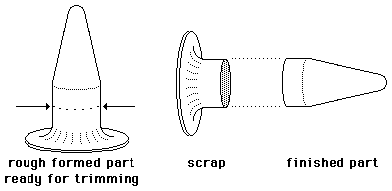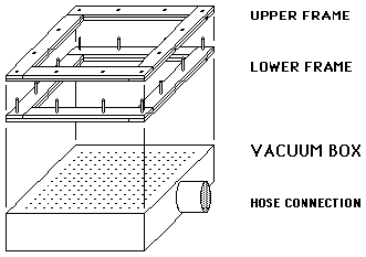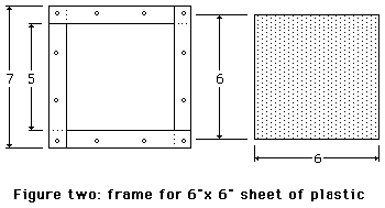 | Vacuum Forming (The following article was originally published in SNOAR NEWS around 1985, including the original bitmapped MacPaint illustrations) How to Build and Use Your Own Vacuum-Forming Device By George Gassaway Occasionally a model requires a special part or set of parts that are not commercially available, and is not practical to make light enough with conventional scratchbuilding methods. In some cases, the best answer would be to vacuum form parts if you had the means to do so. Now you can, with a crude homemade forming device that can be built in one night for as little as $20, depending on materials. It does require two appliances most people have, an oven and a vacuum cleaner. Due to the use of an oven for heating the plastic and the risk of fire if the oven is left unattended, this is recommended only for adult modelers or for use under adult supervision. Building the Vacuum Box: The Vacuum Box's purpose is to serve as a good interface between the plastic held in the holder frame and the vacuum from the vacuum cleaner. Therefore, the vacuum box can be just about any size and can be built from many different materials as long as certain criteria are met. I made the vacuum box from fiberboard, which is fairly cheap but is not easy to cut. Plastic is a good material to make most of the box from, as long as the top of the box is not plastic. The top needs to be some sort of heat resistant sturdy material that will not sag from the combined effects of the hot plastic in the frame and the vacuum itself. The vacuum box needs to have some supports under the top surface to keep the top surface from sagging while forming, the supports not interfering with the vacuum to any of the holes in the top of the box. The box must be airtight, except for the holes in the top surface and the side connection to the vacuum hose (the side connection can simply be a short piece of BT-55 or other tube that fits the hose). The top of the box can be made of pre-drilled perfboard from an electronics store (easy but expensive), or fiberboard/hardboard/plywood with holes you drill yourself (cheap but takes time). Your biggest decision will be in choosing what size to make the vacuum box, as it will determine the maximum size plastic you will be able to form. I chose to make a vacuum box two inches deep with top dimensions of 12" by 18" so that it could handle the largest plastic/frame combination that could fit into the oven, although so far the largest size frame used has been one 13" by 12" to hold a 12" by 11" sheet of plastic. Building the Holder Frame: The frame holds the plastic during heating and forming. There are different materials to use for the frame. Metal would be best for heat resistance, and modelers with the equipment and skills to do metal working may want to make the frame from metal. The frames can be made from 1/4" hardboard (such as Masonite) and cut out, or they can be constructed from materials such as spruce. I have made frames out of 1/8" thick spruce, each top and bottom frame using eight pieces (four atop four others, with the joints overlapping). An upper frame and lower frame is required, the plastic will be held between them. Holes will need to be drilled in equally spaced locations for the bolts and nuts which hold the frames together. It is best to tape the frames together so that the holes will be aligned properly, and make a mark on each frame to indicate how to align them once they have been apart. The best bolts to use are 6-32 with wing nuts to hold the frames together; the wing nuts make installing and removing the plastic much easier. Use cyanoacrylate type glue to permanently bond most of the bolts to the bottom frame, upside down with the threads sticking up. Do not glue bolts in place along one side however, so that they can be temporarily slipped out of place. This will allow you to more easily slide out leftover scrap plastic and slide in a new sheet from the side the bolts are removed from (this way, you don't have to remove and replace all those wingnuts every time you form a part). Since the heads of the bolts will protrude down from the bottom frame, add some strips of spruce along the bottom frame so that the bottom frame will meet flush with the top of the vacuum box for a fairly airtight seal. You will most likely find a need to make several different size frames to hold different sizes of plastic, depending on how large or how small the part to be formed is. Plastic sheets 4"x 4" can handle small nose cones (<1" dia and <2.5" long) and 6"x 6" plastic sheets for larger cones up to egg capsule halves. Some frame sizes will be dependent on the source for the plastic. Evergreen Scale Models plastic sheets are commonly 6" x 10.5", so a special size frame is needed to hold Evergreen plastic (for economy, it is good to make a smaller frame to hold a half sheet too, which is 6"x 5.25"). Once the size of the plastic sheet has been determined, plan out the size of the frame so that the bolts of the frame will be just outside the edges of the plastic sheet. For example, for a 6"x 6" sheet of plastic, the frame should be about 7"x 7" with 1/2" frame overlap beyond all edges of the plastic. There should also be about 1/2" of the frame gripping the plastic sheet. This would mean the frame would measure 7"x 7" on the outside and 5"x 5" on the inside, the frame itself having a one inch "wall thickness" all around. See figure #2. Other items: A holder needs to be made to hold the plastic and frame above the oven rack. This can be any heatproof material that can hold the frame 3-4" off of the rack. Sheet metal can be bent into a large "U" shape to hold the frame. The vacuum box has holes all over the top, but you may want to use a frame smaller than the area with the holes. To effectively cut off a vacuum leak through those holes outside of the frame area, cut out a mask from poster paper. The rectangular hole in the mask should be about 1-2" smaller than the frame in