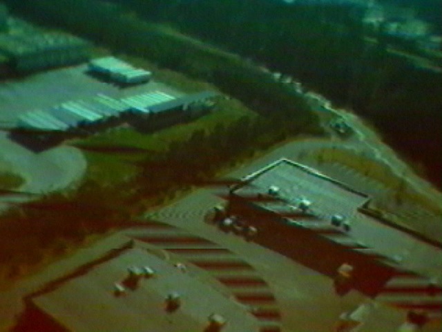 The day ended poorly. The model was flying along at about 400 feet or so when interference problems hit it. The electric motor came on by itself, and the model started to turn and dive by itself (the curved black horizontal dashes in the video and frames are from the spinning propeller, a sort of strobe effect). Came close to getting it to come back, but the interference took over again and made it go down towards a building. I wasn't sure if it went down in front of, behind, or on top of the building. To make a long story short....the videotape proved it was on top of the building (Onboard camera's battery had died by the time I was able to move the receiver/TV gear to the building for a "live" shot). The next day, Ron Witherspoon of the Birmingham Rocket Boys section got it off of the roof, using a ladder arranged by BRB member Steward Jones. Much thanks to Ron and Steward for thgeir help. As the video had indicated, the model had pulled out near the end, hitting a glancing blow and apparently bouncing/skipping for about 20 feet past where it first hit. The only damage was that a control horn had broken off from one of the V-tail surfaces. Click here for Quicktime movie (1.6 meg). | ![]()
