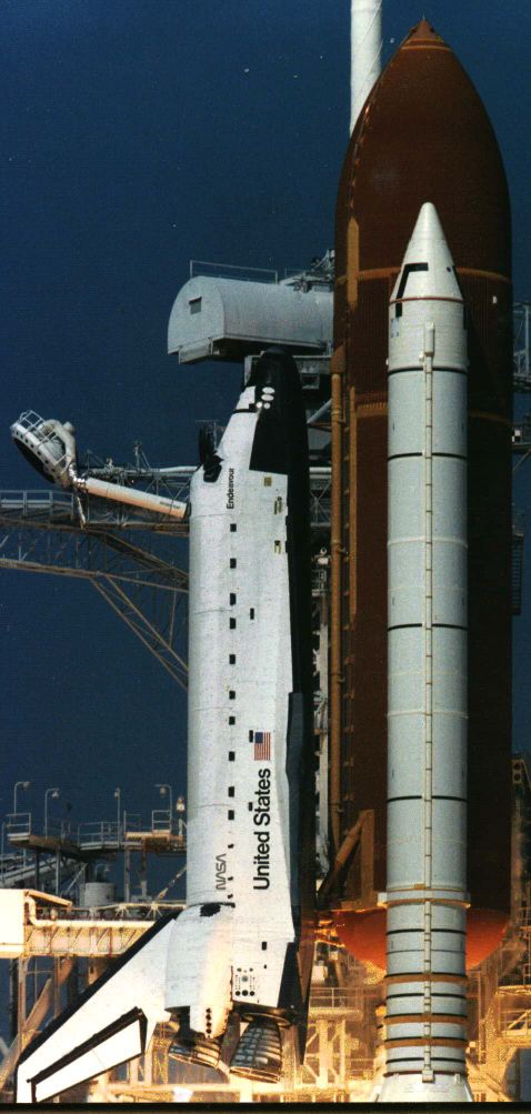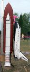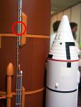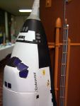 | Information on the NARAM-41 model: The model was built over a 2 month period starting early June 1999. The technical details were mostly the same as for the 1998 boilerplate, except for no attempt to add an A3 "staging" motor mount to the orbiter. Orbiter construction was similar to the 1984 orbiter - a balsa fuselage, wings, and body flap, with a vac-formed nose section. However the vertical tail (rudder) was vacuum formed, not balsa. Other details included OMS pods (mostly vac-formed, with hollow-cast aft thrusters and OMS engine nozzles), The External Tank (ET) was also much like the 1998 boilerplate ET internally. However to cut mass it used a fiberglass body tube, made by Jay Marsh. The ET aft dome, which before either was not on boilerplates or used a vac-formed copy of the inaccurate NCR kit aft dome, was to the correct shape thanks to a wooden vac-form mold turned by Jack Hagerty. Also for the first time the intertank was simulated fairly accurately, thanks to a laser-cut pattern made by Tom Campbell. The cardstock lasercut pattern was used as a master to produce an RTV mold. Then the RTV mold was used for creating epoxy/fiberglass wraparounds (the pattern was for 180 degrees so two were needed). Additional detailing was added, some by making RTV molds of Monogram shuttle kit parts then casting the parts, others by building up from scratch (such as the pipe/conduit strips). For the orbiter separation sensor, a very small microswitch was mounted into the Lox line where it enters the orbiter on the real thing, the switch pressed down by the orbiter until it seps. The wiring was run up inside the Lox line all the way to the intertank. For painting, a spray can type of Red Oxide primer by Wal-Mart turned out to match the colors of this mission. For the lighter yellow-orange color of portions of the tank, "Daylight Orange" by Polly-S was airbrushed onto separate parts before final assembly (in retrospect it's a bit too orange). For other areas where it was not practical to paint the part separately, particularly the bands along the top and bottom of the intertank and a band below the "beanie cap" on the ET nose, white decal sheet was airbrushed with the Daylight Orange color then portions of the now solid color Daylight Orange decal sheet were cut to shape and applied. Pieces of the orange decal were also used on the simulated support brackets of the pipe/conduit lines. The ET nose was similar to the boilerplate, vac-formed using an old NCR shuttle balsa ET nose as the master pattern, except this one had added detailing and the need to hide the flight computer power and ejection arming remove before flight pins. On the boilerplate no attempt was made to hide them, using regular 3/32" phone jacks. For this model, small lever switches were built into housings so that a 1/32" pin could be pressed into place to hold the switch lever down. The orientation was chosen so that acceleration (or deceleration) on boost would not cause the lever arms to move once the pins were removed. This approach allowed hiding the holes for the remove before flight pins between a pipe and conduit strip running down from the ET nose. It is visible in the photo at right but it seems the judges didn't notice. The Orbiter used a similar method, with its 1/32" hole aligned with a 1/16" hole in one of the RealSpace Decals. The SRB's also were technically the same as for the boilerplate, except for the use of fiberglass tubes made by Jay Marsh. The SRB's used the same kind of wind-up timers for recovery system activation. However the fins were different, instead of plywood glued externally, the NARAM model SRB's used .06" Lexan fins, with a 7/8" long tab glued inside the vac-formed aft skirt. It is not easy to tell in photos but the portion of the fin ahead of the aft skirt is not attached to anything, it parallels the side of the body tube with about a 1/16" gap. Only with fin material as sturdy and strong as Lexan, particularly .06" thick, can such a trick of using just a tab be acceptable structurally and for the not-too-high flight loads (this does come at some price, notably higher fin mass, and even Lexan could snap given such a relatively small tab). Details such as the hold-down struts, aft sep motors, and the forward portion of the system tunnel came from using the Monogram kit parts as masters for RTV molds and casting with Alumilite. The systems tunnels themselves were 1/8" wide half-round from Evergreen scale models. The SRB noses were hollow-cast from an RTV mold based on the Monogram kit. The "hollow-cast" method used for those noses and the orbiter SSME's was the slush-cast method, where a small amount of resin (with some microballoons in this case) is poured in, the mold rotated around horizontally cement-mixer style to coat the mold inside, then pouring out some excess and continually rotating the mold by hand until it sets up stiff enough. With a fast-curing resin like Alumilite that is practical, anyway, but does take some time and trial and error to master the technique. SRB painting involved first using white primer to get the tubes smooth, then after applying external parts using another coat of primer before going to gloss white. Krylon white primer and gloss white was used for those purposes, not as fine as some other paints but having had some painting problems earlier in the year on the X-20/Titan-II I went with what was reliable in the past. Actually first I had tried to use just gloss white on the tubes and found that the fiberglass tubes really need to have a primer, some discussion with Bob Biedron and Jay Marsh showed me how silly that idea had been to not use primer. There was no paint other than the white, but the SRB's are not just white. On several missions, the SRB noses had a complex series of markings, which are no longer used. But I liked them, gave the shuttle a bit more of a complicated look even if it was just a little black paint. On this model those markings were done by