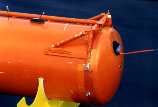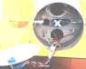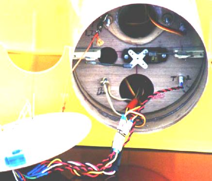 3/4" hole in Aft Dome allows extended nozzle of F motor to poke thru, note nozzle and ignitor leads.