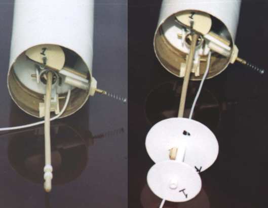 RIGHT: Parachute storage spool shown attached to end of dowel (normally attached after timer is wound and SRB attached to ET). Parachutes are stored between the spool discs, which assure that the chutes are not only pushed out of the tube but also assure the chutes do not stay inside the hollow (vac-formed) SRB nose.