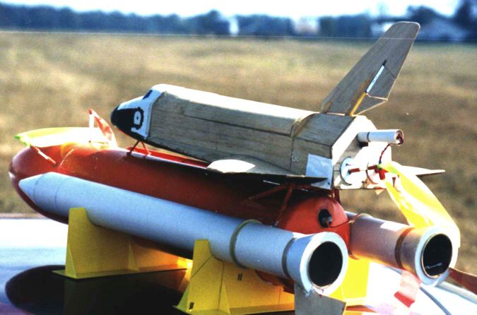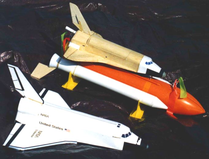 Two Shuttles: 1/72 boilerplate shuttle stack and 1/60 "sport flying" orbiter (1/60 orbiter boosts o n a special non-scale piggyback rocket, not shown). The 1/72 orbiter was built for a full stack boilerplate in 1984 and has been modified for more recent flying. Both orbiters use movable rudder for turning control. The elevons move only as elevators for pitch control, as mixed aileron (elevon) control was found to be too hard to fly.