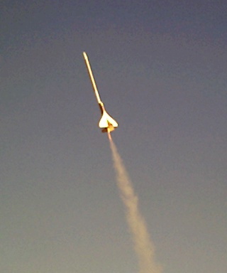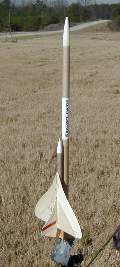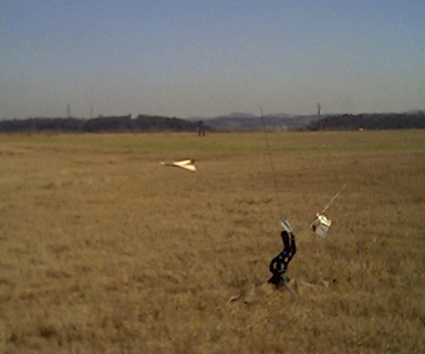 A crude prototype was built (just one SkyDart), and an old finned BT-55 model was pressed into service. It was test-flown at the December 18th Birmingham Rocket Boys launch. It was hoped it could boost straight enough without another SkyDart on the other side, but that wasn't the case. It arced on its back and went far downwind on boost. After that, a third BT-55 tube section was added, the launcher was tilted more into the wind, and the rudder was held full over to help make it roll on boost. The boosts were safe but went into the wind a lot, cutting the potential altitude and ejecting well after apogee. But the flights achieved the main goal, to see how well the model glided and how well the rudder control worked out given that the SkyDart lacks dihedral.