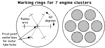 For more than 2-engine clusters, mark off more reference lines from the center of the main ring, spacing all the lines the same angle apart (# of outer holes / 360). For example a 7 engine cluster with 6 outer engine tubes, make the lines 60 degrees apart from the center. Determine the radius location for the center pivot point of the outer tubes, mark off the radial arcs, then put 1/32" pinholes into each location. You may want to do the above with a plastic ring instead of plywood, and save the plastic ring to use as a template - that way you don't have to mark off every complex ring you want to make, just use the plastic ring as a guide to transfer every complex ring like this that you want to make, just use the plastic ring as a pattern guide to transfer the pivot pinholes to the material you plan to cut the real rings from.