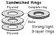 The multiple ring method also can be used for making stiff rings that are strong but also light. Make up two plywood rings of whatever thickness would be suitable, then make a thick balsa ring - using one of the plywood rings as a guide for cutting out with a model knife. Glue all three together to create one very thick, stiff, strong, yet relatively light ring.