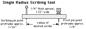 The scribing tool is essentially a crude custom beam-compass for each desired inside or outside tube diameter. A piece of spruce 1/4" tall and 1/2" wide is suitable for the beam. The pivot point is a pin such as a map pin or round-headed pin (as used to put notes on a cork board), about 1/32" diameter, protruding about 1/4" from the bottom of the spruce beam.