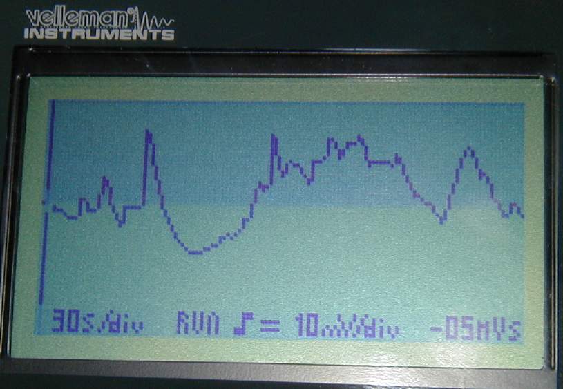 Photo Thumbnails of Velleman HPS-10 Handheld Oscilloscope in "Rollmode" to produce a continuous temperature trace. Click for moreinfo (pdf's) on the HPS-10 , or here for the user'smanual.