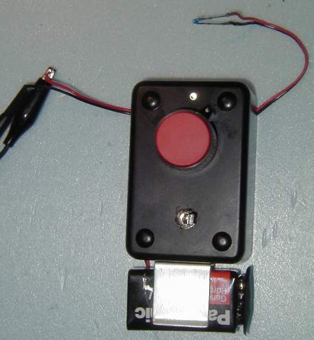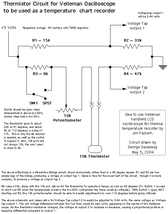 | Thermistor Circuit for Velleman Oscilloscope: A Wheatstone Bridge type circuit is used by the thermistor and other components to create a zero or near-zero voltage output for the Oscilloscope to read in DC mode. The circuit produces plenty of sensitivity when used in combination with the scope. Tentative results indicate that when the scope is set to a resolution of 5 millivolts, the screen plots a temperature range of about 2 to 2.5 degrees. That is a pixel resolution of about 28 pixels/degree to 22 pixels/degree. If the scope is set to 10 millivolts, then range plotted would be around 4 to 5 degrees, with pixel resolution of about 14 pixels/degree to 11 pixels/degree. The project is still a work in progress. No field or flight testing yet. Among other things, I need to get the right kind of BNC connector for building a cable to hook between the Scope and the Thermistor Circuit box, rather than use the test leads. Also long permanent leads for the thermistor. And to rig up a "holster" for the scope to fit into, the holster itself to be mounted to a thermal pole. It will use a typical sunshade for the thermistor, a 3" diameter disc of foam with chrome trim monokote on the top and sides of the foam disc to reflect sunlight (The photo of the thermistor circuit black box shows a bare thermistor on very short leads as soldered up for bench testing). |