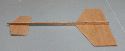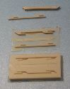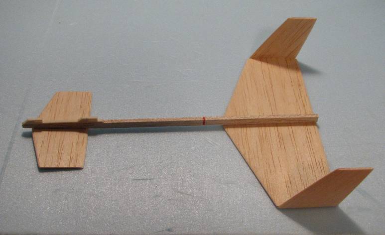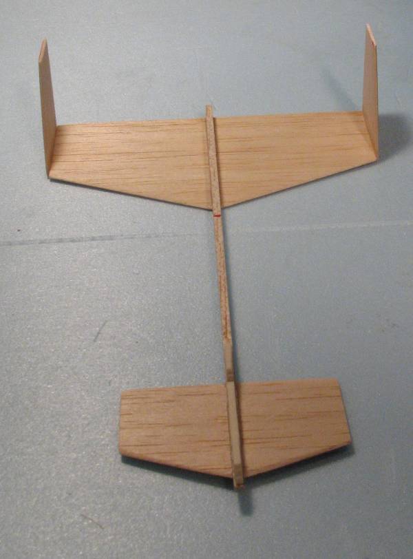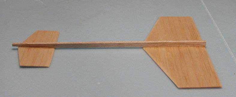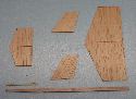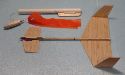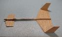 | | The parts for the glider. The main wing, canard, and rudders are made from 1/16" balsa. The main fuselage is 1/4" by 1/8" hard balsa. The cast glider hooks are available from George. The glider will fly a little better if you round the leading and trailing edges. A little better still if they are airfoiled. But it will fly without any rounding at all. |