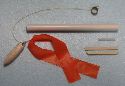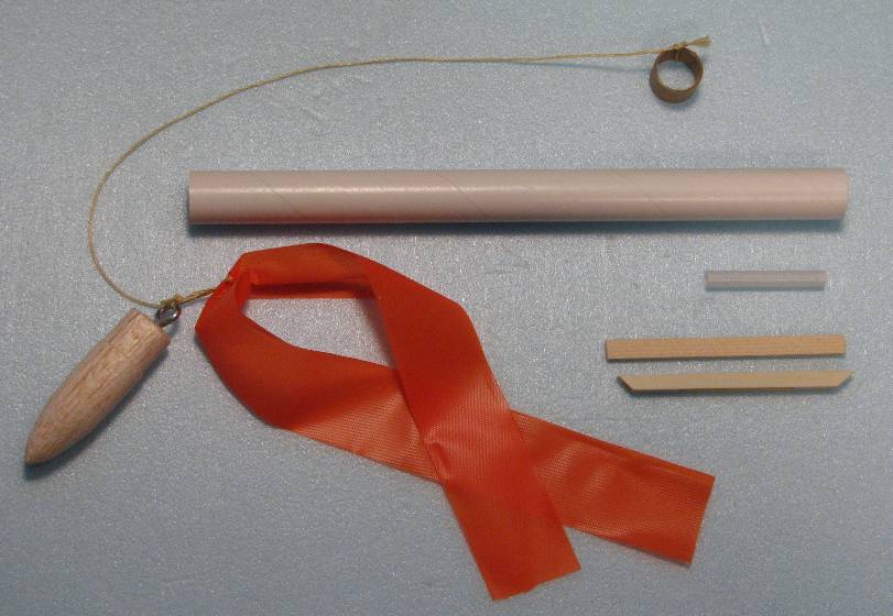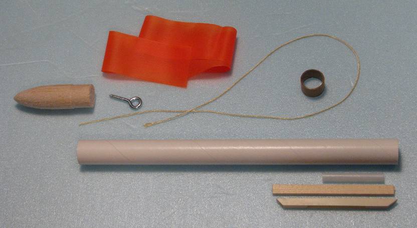 | | Parts for the Pop-pod. See the Plans. | | Kevlar cord tied to mounting ring and screw eye on nose cone. Apply a little glue to the knot. |