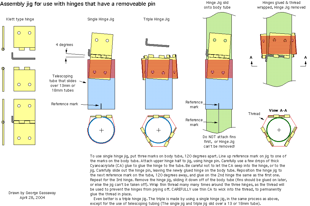 Rotaroc - Designed by George Gassaway. For this event, the Rotaroc- 18mm Plan. There have been variations by others, such as the QCR High Rotor kits, and the Apogee Heli-Roc kit. The basic design is a straight body tube with simple blades folded flat to the tube on boost, the folded blades in a triangular cross-section. The design is not too hard to build, though some people dislike attaching the hinges. It's a reliable competitive design that usually puts in solid flights. Rose-A-Roc - Designed by Art Rose. There have been variations designed by others, such as the Whirl-A-While by John DeMar, and the Chicago Chopper by Pavel Pinkas, but those are 13mm A sized plans. The basic design is to make the model as small in cross-section as possible. So the blades split lengthwise, so the chord is half of normal, then folds rearwards to be parallel to the body. Rather than a body tube, most of the body is replaced by graphite tubing or a wood dowel, to give the rotor blades clearance for their lengthwise folds and to have a smaller cross section (frontal view). These models boost higher than Rotaroc type models. In the hands of a good builder, they can out-perform Rotarocs. They are harder to build than Rotaroc types. There is now a Rose-A-Roc KIT by FlisKits! Sized for 18mm engines. There will probably be a lot of these kits competing at NARAM. Internal blade - There is another design which can be very competitive, which involves storing the blades inside of the body tube. To do this effectively, the model needs to have a diameter large enough to hold reasonable sized blades, without the body weighing too much. In any case, the models are quite difficult, high payoff if they work but at a higher risk than more conventional models. So, this is not really recommended for newer competitors to try. Here is a pdf file of theR&D project that Pavel Pinkas of the Chddar-1++ Team wrote about Design of a Competitive Heliroc. The design was an internal bladed model. Qualified flights - OK, sometimes performance does not matter. For various reasons, whether for return or flight points, people just want to fly something that will qualify as a helicopter flight. A sport design that some use is the "Tasmanian Devil" (This is an A sized plan, needs to be scaled up for B power). It could be described as a pre-deployed helicopter, with small blades permanently glued in the open position. It spins up very quickly on launch, causing a lot of drag, making it boost low like a flying saucer type model, and flying for only a few seconds. For that matter, a flying saucer type of model, with properly added spin tabs, can make for a qualified flight helicopter model (like a scaled-down Tri-F-O) Deployment magic - The Rotaroc and Rose-a-roc type designs use the ejection charge only as a starting point to cause the design to go from rocket boost mode to deploy for helicopter descent. Rubber bands are used to make the blades deploy. What keeps them from moving until ejection? Usually a burn-thread which is rigged to hold the model n boost mode. At ejection, the thread burns, allowing the rubber bands to do their thing. The burn thread needs to be thin. The button and carpet type of thread that Estes uses for shroud lines is too thick for anything short of a D12 ejection charge to burn. So use a finer thread. I prefer to use white elastic thread. The Rotaroc plans show how to run the thread to hold the blades. Some designs do not use burn-thread. Such as Pavel Pinkas' Chicago Chopper, and internal bladed designs, where the ejection causes a mechanical action that frees the blades to deploy. The rubber bands need to be selected carefully. Do not just grab any rubber band and try to force it to stretch really far, as the blades may bow outwards a lot when prepped for boost, or the hinges may be ripped off from too much force at deployment. Look for rubber bands with 1/16" cross sections, in various lengths , at Office Supply type stores. Look for the classic pale brown latex bands, colored bands tend to not stretch as much. While the band should not be stretched so much that it causes excessive force, it should not be relaxed at the end of travel so that there is slack, as the blades might not deploy fully. This is not hard to get right, just it can cause trouble if it's overlooked. Building Helicopter models - The two most critical parts of most helicopter models are the rotor blades, and the hinges that connect the blades to the main body. I always liked using Klett hinges, because they had hinge pins that could be easily removed for assembly. Unfortunately, Klett stopped making R/C plane hinges some eyars ago. The most suitable non-Klett replacements are the small hinges made by Du-Bro. However for models like Rotarocs, it is still very useful to be able to remove the hinge pins for some assembly steps, and the Du-Bro hinge pins are not meant to be removed. The hinge pins can be modified though, either using vice-grips to un-crimp the crimped end, or using a Dremel tool with cut-off wheel to remove the flattened crimped end of the hinge pin. Rotors are much like making wings for rocket boosted gliders. Except the rotors are smaller in chord and tend to be more fragile. The instructions that Pavel Pinkas wrote for the Chicago Chopper has good info on making rotor blades. It is an "A" sized model, but the info on making blades is useful regardless of size. Weight is a an important issue for helicopter models, regardless of design. The lighter, the better, as long as the blades (and the rest of the model) are physically strong enough. Try to find reasonably light balsa for the rotor blades, but without being so weak that the blades will bow outwards too easily when the blades are folded for boost. Long narrow blades can be hard to sand to shape, as they are so relatively fragile. See the Rotaroc-A plans to see how the trailing edge portions of the blades can be sanded to rough shape while still attached to 3" wide balsa sheet