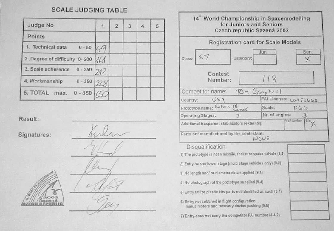 | Judging scores for George's Shuttle | Judging scores for Tom's Saturn-IB | Static Scores for S7 | |