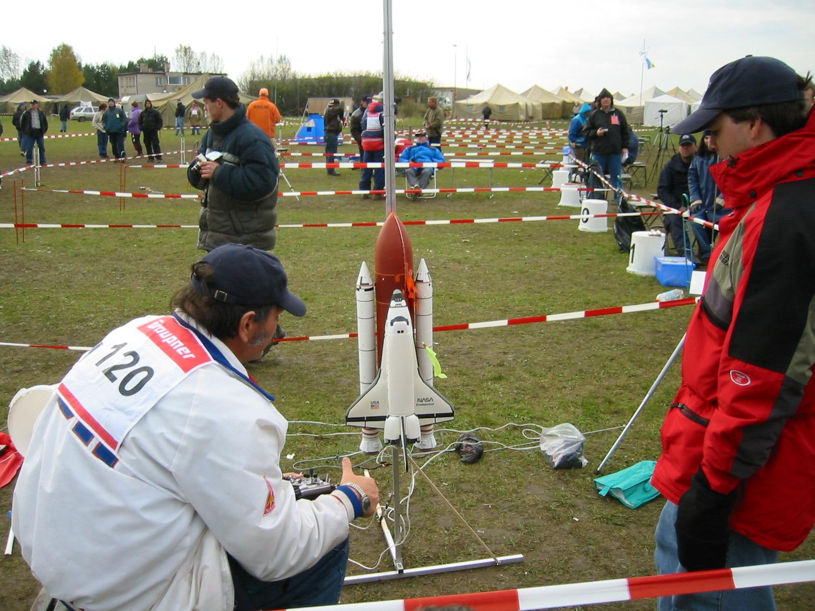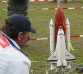 | Tom Campbell and Jay Marsh prep Tom's Saturn-IB. | Tomwith his Saturn-IB. | George preparing Shuttle for Flight | Shuttle Flight Video by Ross Hironaka |