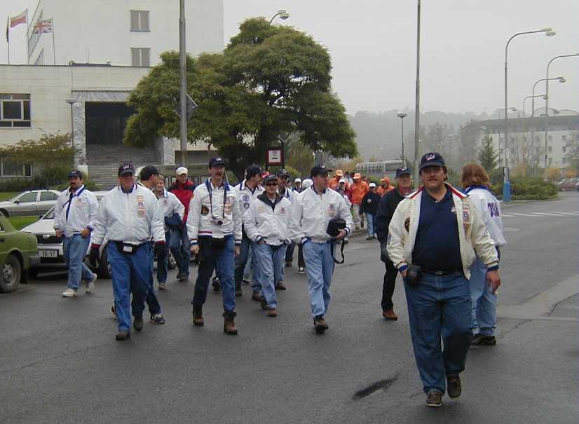 | Team walks to the opening ceremonies | Hotel Sport in background | Bridges across one of the rivers that flooded many areas of the Czech Republic, including Kralupy | Ceremonies held in an auditorium in Kralupy |