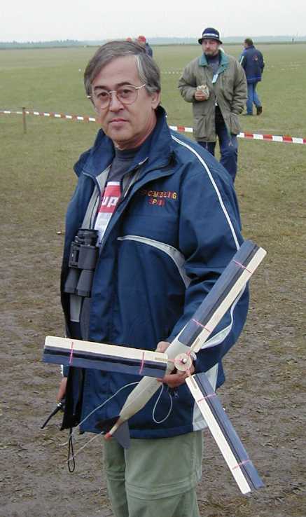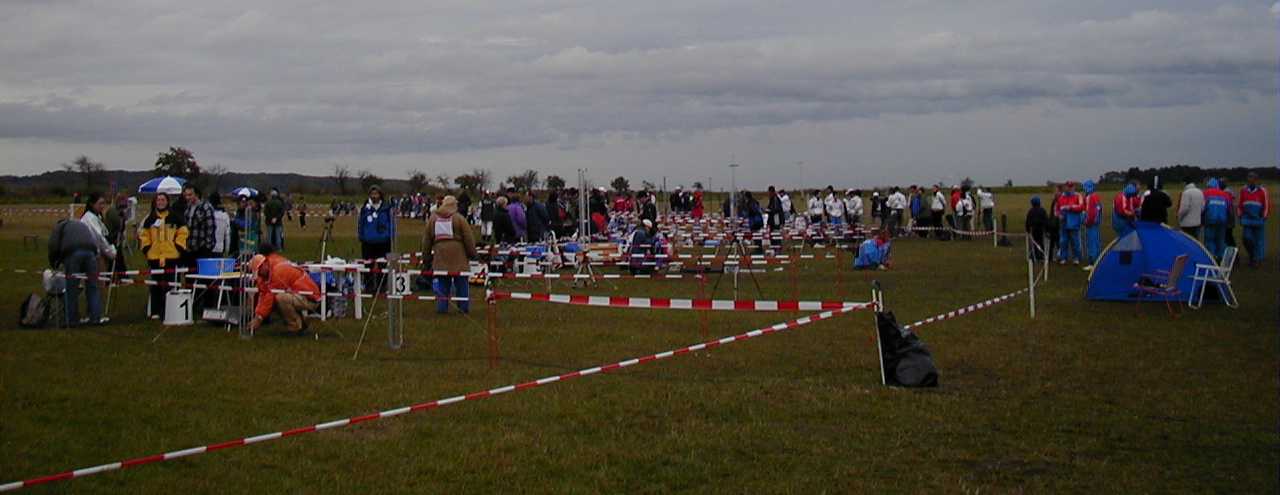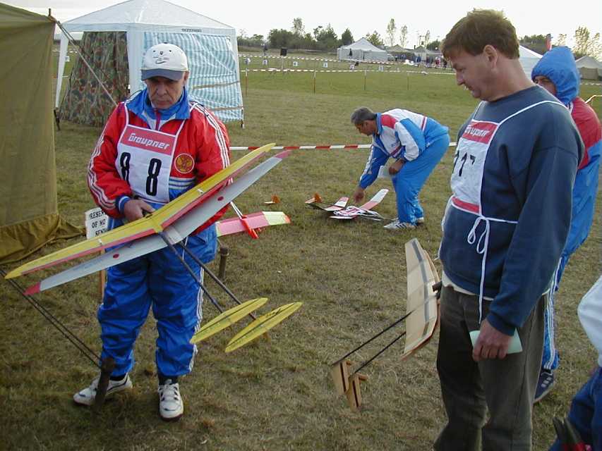 | Day one dawns at the Sazena airfield. The airfield is used for full-sized sailplanes | Overview of launch area. | Jay Marsh, Kevin Kuczek, and Dave O'Bryan flying S6 (Streamer) | A Slovenian S1 (Altitude) model |