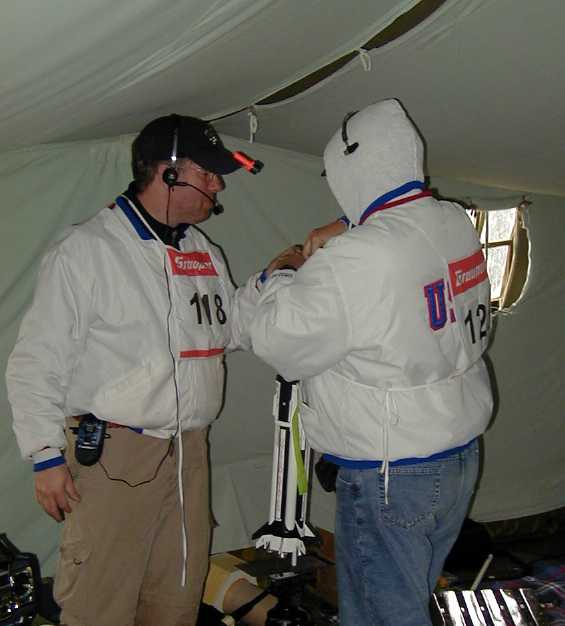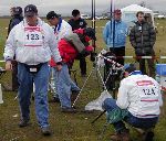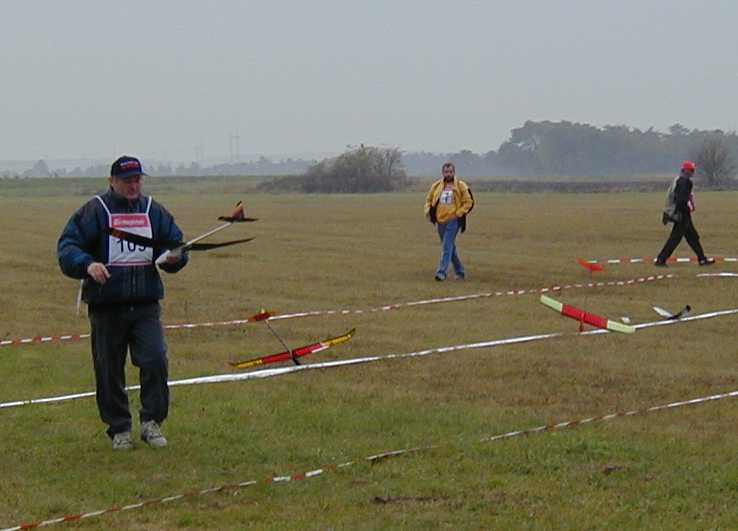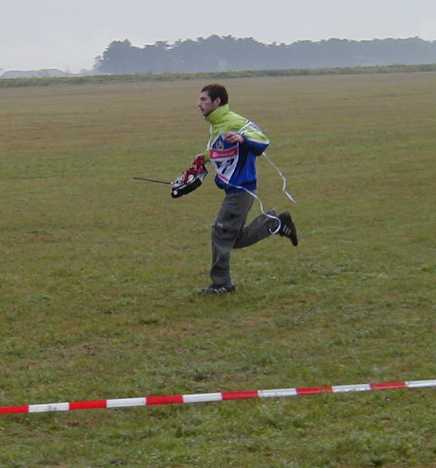 | Tony Reynolds gets his S1 model ready for launch as Chad Ring looks on. | S8-P model check-in. Phil Barnes (right) looks at two models using flaperons. Phil was 4th in the WSMC event, but WON the World Cup event on Saturday. | S8-P landing area. Two models really ARE stuck nose-first into the ground, no Photoshop tricks. | A pilot in a futile run to turn in his transmitter before the 12 minute flying window ends. He was DQ'ed. |