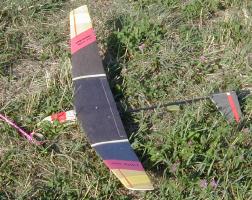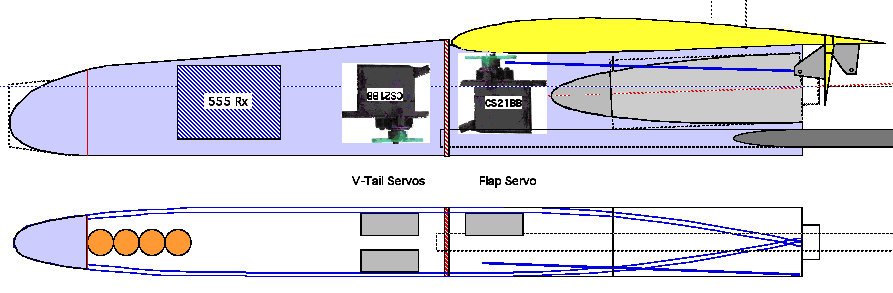 ![]() Balsa fuselage before pinching nose to glue front bulkhead | ![]() Top View | ![]() Completed, with Flap Servo |