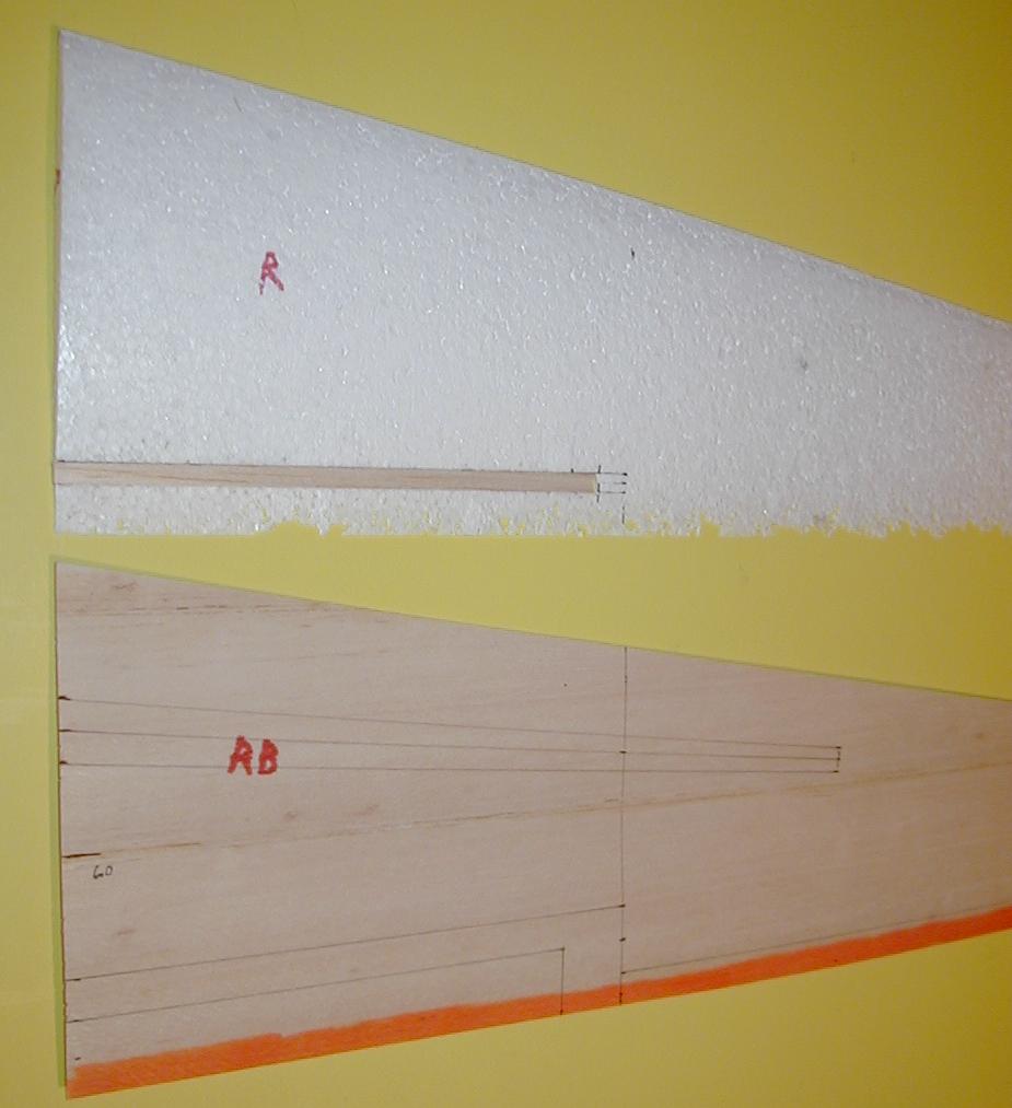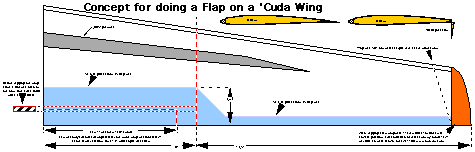 | The wing layup was modified in several ways. It had to be reinforced to make it strong enough for a 14" span (7" half-span) by 7/8" chord Flap to be cut out of it after the wing was completed. This required, for each wingskin, adding some .005" graphite strip in place of the normal fiberglass "spar", and some fiberglass cloth for the last 2" of the wing chord (to Trailing Edge), from Root out past the Trihedral joint. Also, a solid balsa spar insert, laid up during the skinning and bagging process, to give solid support where the hinge line would be cut later. For more info on how the Cuda-Flap wing was prepared, go to the Wing Assembly Page. To increase the span a bit, the tip was not trimmed diagonally as for a normal Cuda. It was left square, then a 1" wide tip block was carved, rough shaped, and glued to the tip. Then sanded to final shape. | |