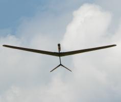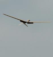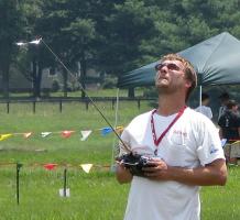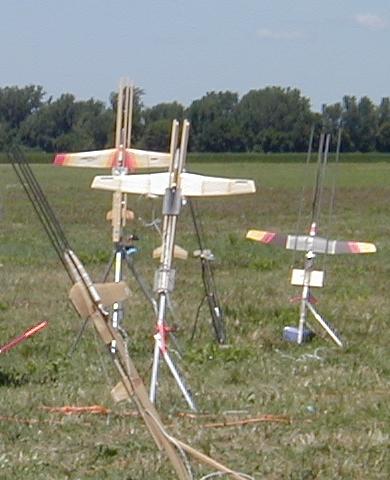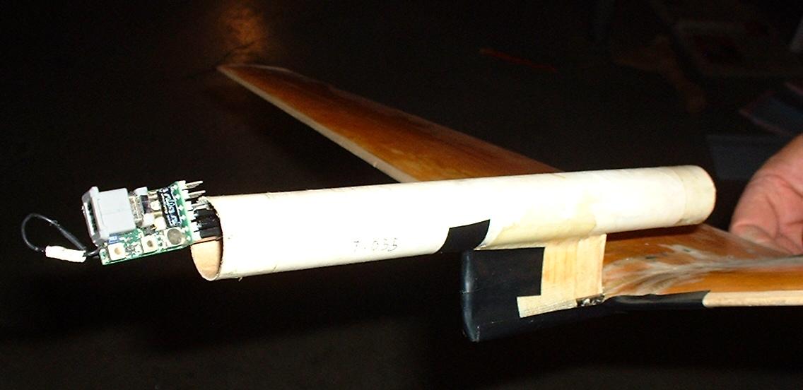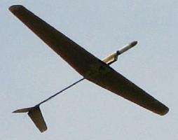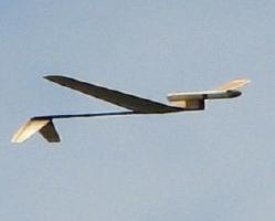 | The Cuda-Flap model worked out nicely. The Flap was very effective. It required a few flights to work out the correct amount of down elevator compensation so that the model did not balloon up and stall when the flap came down, or dive from too much over-compensation. The Flap deployed nearly 90 degrees. That was so much as to make it act like an airbrake. I could put the model into a 30 degree dive with little increase in airspeed, and it could even dive into the ground at 30 degrees without damage. It also could dive more steeply than that, I sometimes dived it at 45 degrees, though it did increase the airspeed a bit, but still nothing like would happen with flaps only deployed at 45 degrees or so. One drawback was with so much drag, when I leveled it out for landing to try to do a final steering correction for the runway tape line, there was very little "hang time" before it would stall and land. In theory I could have been adjusting the throttle stick to vary the flap angle, but I found that it was more practical to go with either all down or retracted. For the flyoffs, the model itself worked well. I made a mistake on one flight and let it land off the end of the runway, caught by the wind. Came in 4th. But months later, George Riebesehl, who had won using a normal Stingray (no flap, no spoiler, no 3rd channel), dropped off the team and I moved up. For the 2002 WSMC, the S8EP Team members used Stingray-Flap models, so I had no pressing use for flying the old Cuda-Flap models. In 2004, when I got a BoosterVision onboard video camera, that changed. I modified one of the Cudas to carry the BoosterVision camera. Eventually, adding a camera pod that rotated 180 degrees after triggered by the flap servo, so it could look aft for boost, and look forward for glide. For more info see the Airborne Video Pages. | ![]() |