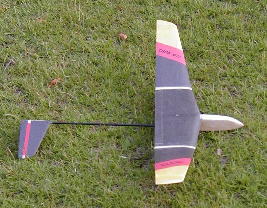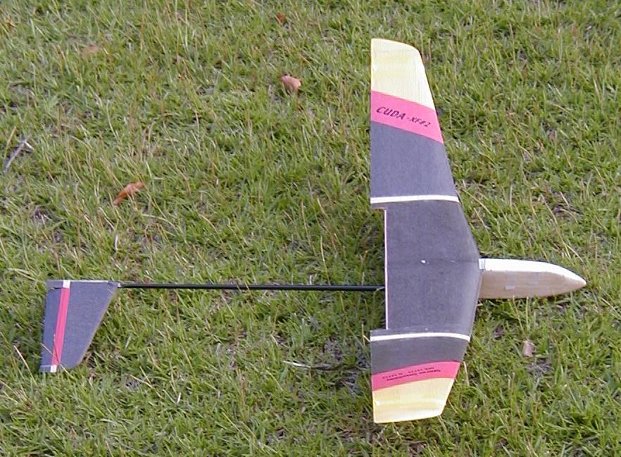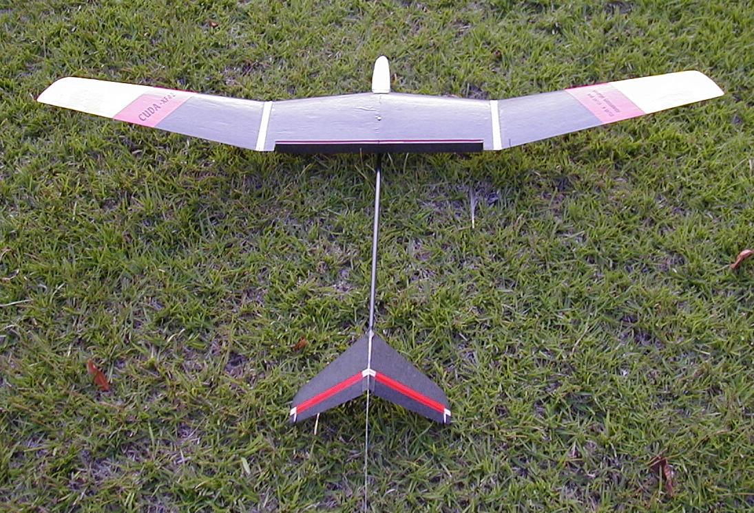 | Cuda Ray by Ryan Woebkenberg Ryan built a flapped model for the very same reason. The S8E-P event, for the 2001 US Team Flyoffs. Ryan also chose to use a Cuda wing, but to modify it. For the fuselage, Ryan chose to use a "Stingray" type of layout. To mount the servos inside of the wings, like a Stingray. And to mount the receiver and battery pack in a pod attached to the front end of the graphite fuselage. As with the Stingray, the wing was permanently glued to the boom. Unlike the Stingray, there are no removable wing panels, so the model has to be transported fully assembled. The Stingray Kits used a molded pod, made of fiberglass, or Kevlar, or even Kevlar/Graphite. Ryan simply used a piece of 24mm tubing, making it long enough not only to hold the engine, but also to hold the receiver and battery (Kevin McKiou's prototype Stingray was made the same way). Running the wiring for inside the graphite boom, thru the pylon. For the wing, Ryan chose to just make it as a simple "Vee" dihedral. With a flap on each side of the wing. He simply used one servo with a "Y" yoke to allow that one servo to move both flaps equally. His model flies well and is a reliable performer. | |