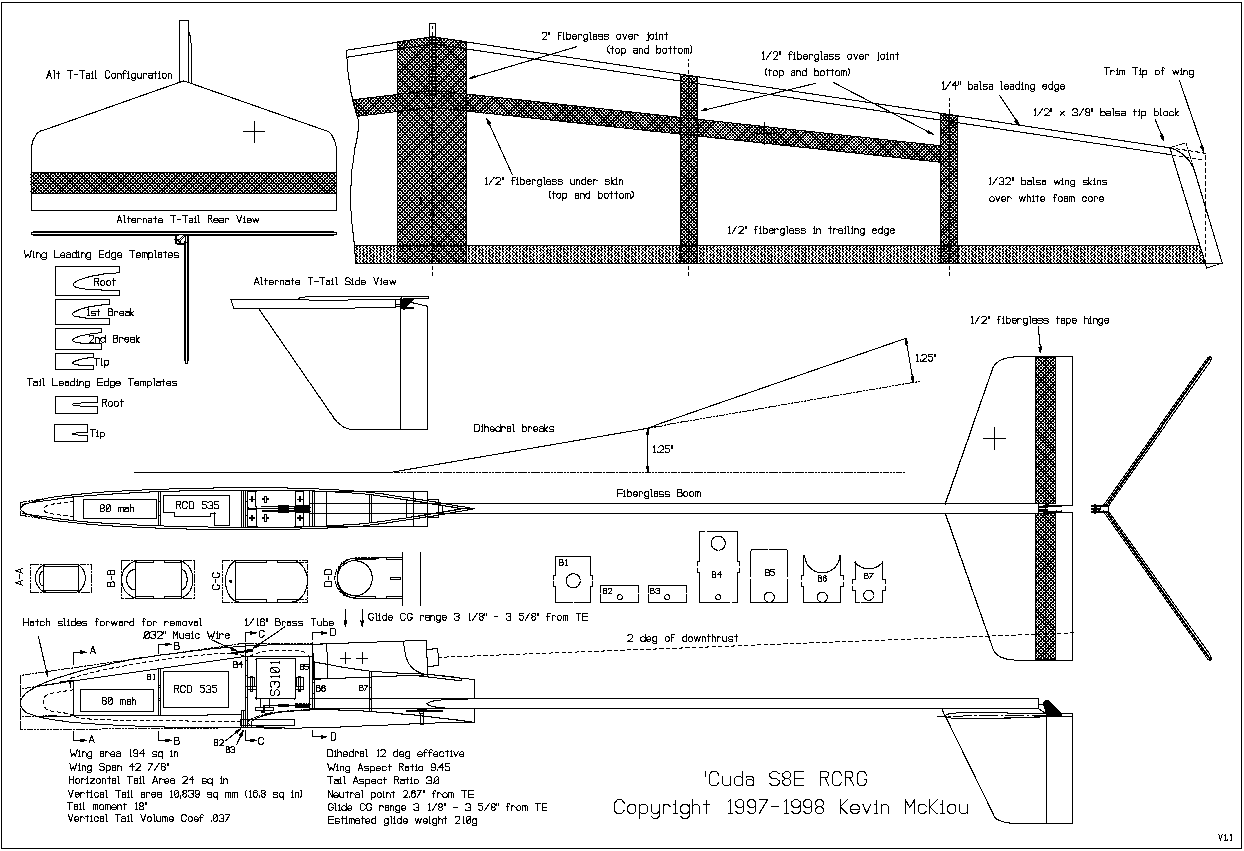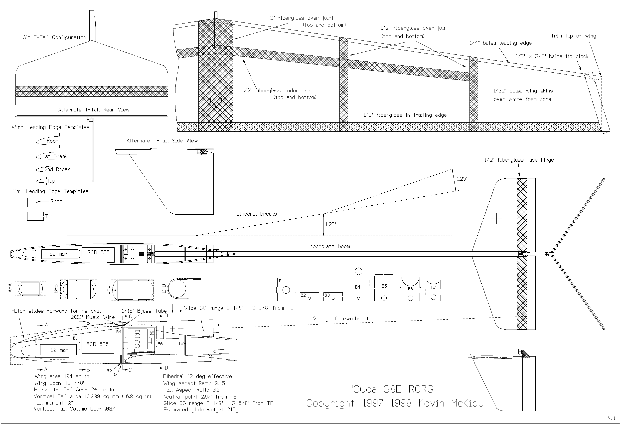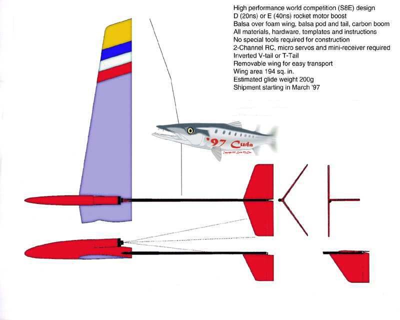 |   | Kevin McKiou created the excellent Stingray all-composite S8E model for use at the FAI WSMC level. He later also created the Cuda R/C R/G, as an easier and much less expensive design using balsa skinned foam core wings and laser-cut balsa parts. He created a small company called VectorAero to sell them. Unfortunately, Kevin shut down "VectorAero" several years back. Here is a link to an ARCHIVE of VectorAero on the Internet Archive. | The Cuda files and plans are presented with the following provision by designer Kevin McKiou: "I have no problem making any of this stuff public. In fact, the more people have the information, the more likely it is to live on. I think the only caveat I would place on it is that if anybody uses any of the design information - even if they change it - they must make their work "open source" and available free to the public. This would be like a GNU open source software license. This would not prevent anyone from making kits, but if anyone uses Cuda designs as the basis for a kit of a new design, they must make their design and documentation available free to the public. The same with the airfoils." | Cuda Instruction Manual as PDF file. KM7 Airfoil Coordinates. Cuda Plans as GIF File Cuda Plans as PDF File Cuda Plans as HPGL File Cuda Plans as a DXF File, Zipped More to come later. |  Kevin (left) flying his Stingray in S8E at the 1996 WSMC in Slovenia  Kevin was on the US Team that took the Team Silver Medal at the 1996 WSMC |