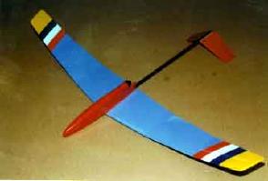 | T-Tail Option Unless you have done V-tails before, use the "T" tail option, as seen on Jim Filler's model at right. This is because the servo motion, and linkages and control horns have to be dead equal between left and right. If not, then you will have up elevator introduce some unwanted turning, or right rudder causing some unwanted pitch response. | |
