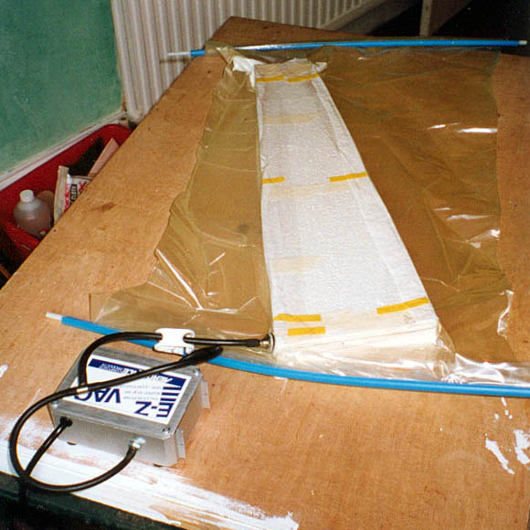 | It is possible to use weights to compress the cores together, as shown in the manual. But do not skimp on the weight, note the manual mentions using 200 to 300 pounds! A Vac-bagging system is highly recommended. Whatever you do, MAKE SURE that once you have the skins and core together, laid correctly into the foam beds, that you use some masking tape to help keep everything aligned. Using weights, it is certainly possible for the epoxy to act like grease, to let one of the skins slide to one side, especially if the weights are not balanced out well. If that happened, the whole wing panel would be ruined At right is a photo model by Alex Seltsikas when he built his Cuda. It shows his wing skins prepared, and marked, with the fiberglass spars and trailing edge fiberglass laid in place of where they were applied after the epoxy was squeegeed on. The photo shows both sets of skins with the masking tape hinge connecting the trailing edges, and the wing core for one wing looks like the right wing's core. The skins and core are laid on top of a Vacuum Bag. | |