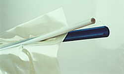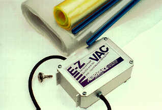 | The long thin blue object near the bottom is the "Bag Clip". The bags are actually "tubes", sort of like a clear (or transparent yellow tinted) garbage bag, with the bottom cut out. The Bag Clip allows one end of the "bag" to be folded over with the Bag Clip's round core, with the "C" cross section blue clip snapped in place to seal off the bag. A similar clip is used for sealing off the other end. In this next photo, Alex has the skins and core done, inside the bed, and masking tape holding the beds aligned. The whole thing is inside of the vacuum bag. The simple EZ-Vac pump is on, continuously pulling 7 to 8 inches of mercury vacuum to compress everything together. In this case, Alex did not use any "breather felt". He just placed the vacuum port right near the corner of the core & bed assembly. It is possible for the vacuum to be blocked off by the plastic bag, and not let the vacuum reach all locations. So, normally a thick porous cloth, sometimes felt, is used so that the air can travel freely to be sucked out by the vacuum. That is shown in the next photo at right, taken from the ACP website, showing the vacuum port on top of a large piece of breather felt (white) that is inside of the bag, but underneath the wing being vac-bagged. |  |