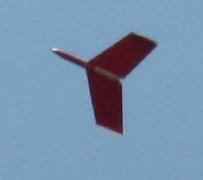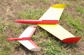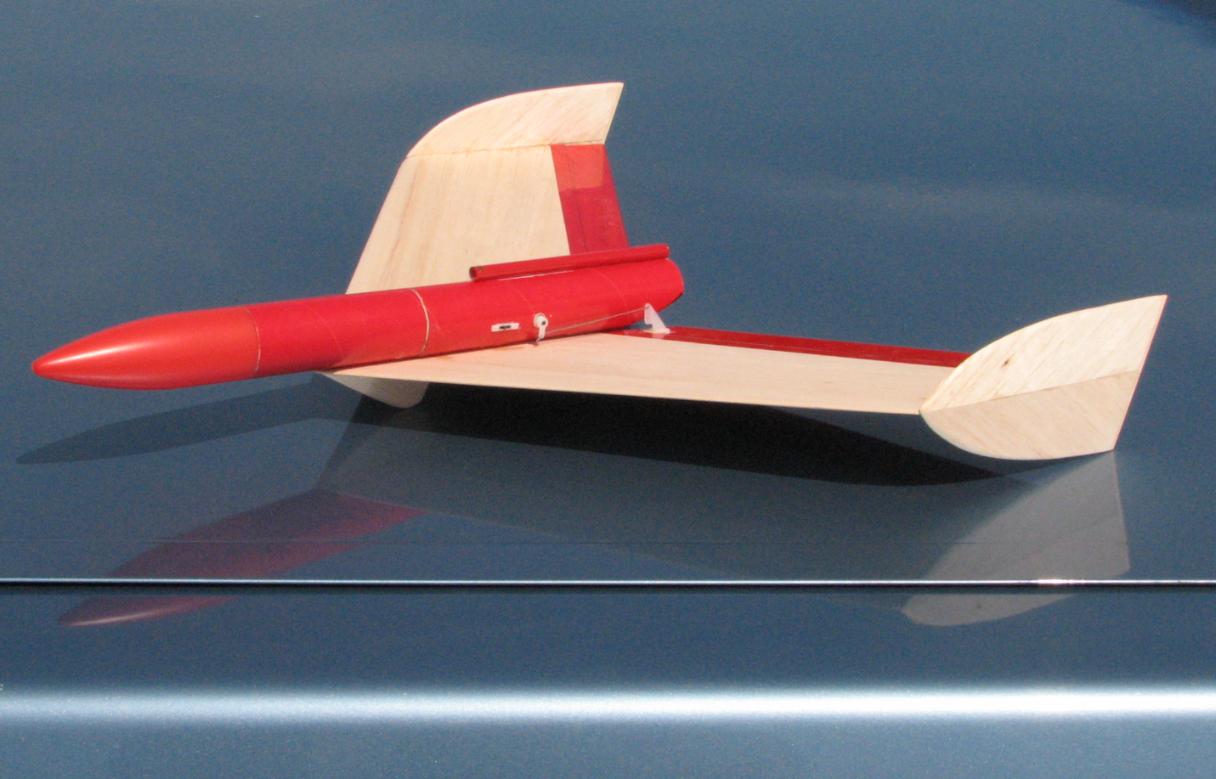 The wing was simply 1/8" balsa. The elevons also 1/8", but from a bit stiffer and heavier piece of balsa. Also, the whole elevons were covered with red Monokote to stiffen them against twisting. The Monokote was also used as a hinge.