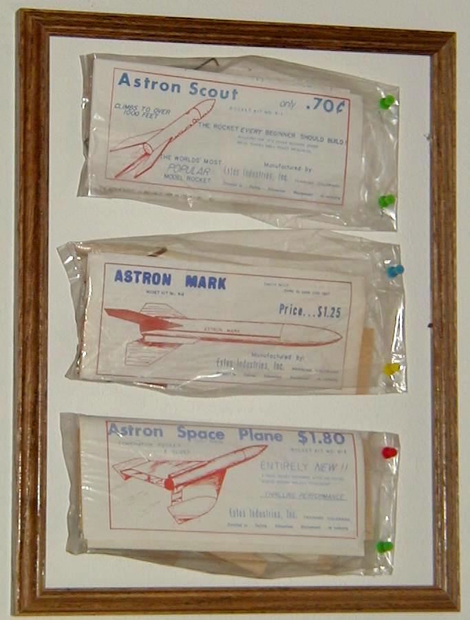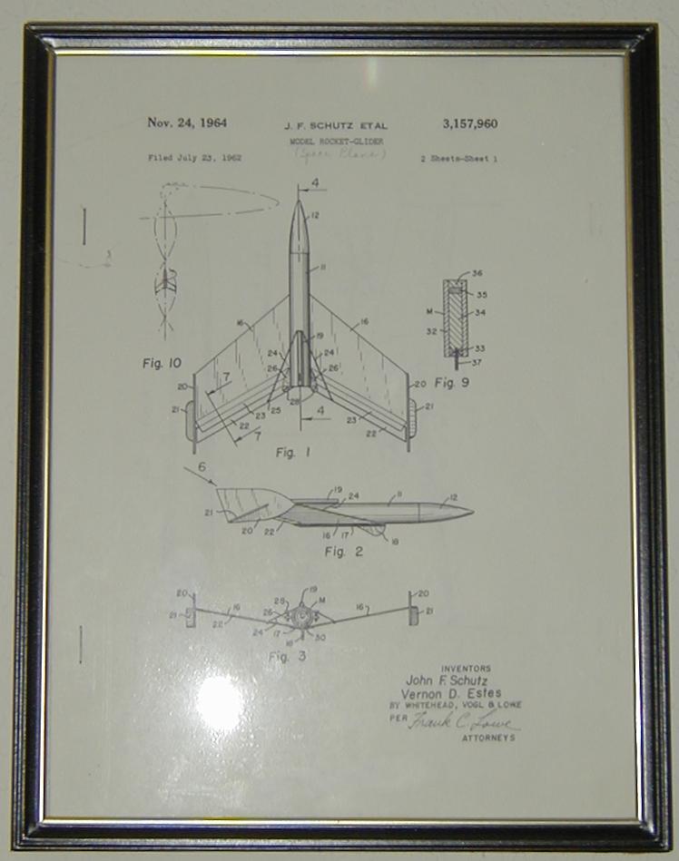 In 1964, John Shutz and Vern Estes were awarded a patent for their "Model Rocket Glider". See photo at right. The photos at left and right were taken in Vern's rocket history room in 2000 (NARAM-42).