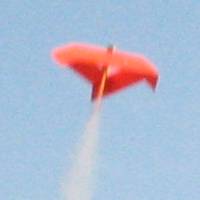 Tri-F-O © copyright 1996, 2004 by George Gassaway & the NAR Commercial rights reserved The name Tri-F-O stands for Triangular "UFO". This model is a relatively easy to build balsa model which flies somewhat similarly to the circular cardstock Flying Saucer introduced by Centuri in 1977 and also in plastic from by Estes years later. The model is primarily built from 3/32" balsa. Non-wood parts required are one 2" length of 18mm tube for the engine mount, an engine block, and a launch lug for flying off 1/8" launch rods. The plan shows full size templates for the struts and spin tab joint reinforcements, photocopy them so as not to cut into the magazine to use them. Due to space limitations the triangular body side and spin tab shapes are shown 1/2 size, but those are easy to draw out. Cut out all parts, being careful that the wood grain runs in the right direction. Prepare the wood parts by sanding the leading and trailing edges of the struts, the leading edges of the side plates for the triangular body, as well as the trailing edges of the spin tabs. Sand the 45 degree diagonal edges of the side plates to a bevel of about 45 degrees, so the joints will match up well when the three side plates are glued together. Finish: If you want to have a smooth finish on the model, it needs to be done before assembly as most of the balsa surfaces cannot be easily reached by sandpaper after assembly. A coat or two of sanding sealer is all that's needed for a somewhat reasonable finish. However, the prototype had no sealer, it was sanded smooth then after assembly sprayed flat white for an undercoat and fluorescent orange for the final color. Assembly: Use tape to hold the edges of the side plates together, to create the triangular body. The tape should go across the top of the corners, and the placement adjusted so that the three side plates are held aligned in the proper position for gluing. Use thin Cyanoacrylate glue (CA) along the inside of the corners (opposite of the side with the tape) to tack-glue the side plates together. After the CA has cured, remove the tape, careful not to pop the tack-glued joints loose. Than use more CA along the inside of the joints for a solid bond. Be careful not to use so much CA that it runs. After the CA is cured, use sandpaper to round off the sharp outer corners of the joints. Use the guide in the plan to mark onto the engine tube the location for the 3 struts. Use a door jamb as a guide to redraw those marks into parallel lines for the strut roots. Insert a standard size 18mm engine into the engine tube, using tape for a friction fit so the engine top is flush with the top of the engine tube. This should leave exactly 3/4 of the engine protruding down from the tube. Place this on a flat surface. Hold one of the struts in position alongside the motor tube, with the trailing edge of the strut root even with the bottom of the motor tube. The tip of the strut should just barely touch the building surface, as the strut has 3/4" sweepback. Apply a little CA to tack-glue the strut into place on the engine tube, being careful not to let the CA run to accidentally glue the engine into the tube. Repeat with the other two struts. Remove the engine. Since the struts may not be exactly 120 degrees apart, lay the strut/tube assembly upside down into the triangular body assembly (also inverted). With the strut/tube assembly centered, carefully pry the struts if necessary to get them seated into the inner corners of the triangular body. Then apply CA for the root edges of the struts, along the tube, to permanently glue the struts to the tube (do not glue to the triangular body yet). Insert the engine back into the engine mount tube, leaving it hanging out by about 1.5", with a slip-fit that is not too tight or too loose. Set the strut/mount assembly onto a flat surface, with protruding engine holding the assembly above the work surface. Carefully slip the triangular body down over the strut tips, keeping it centered. Press so that the engine tube/strut assembly also slides down the engine, until the triangular body touches the flat surface. If you have done this right, the engine bottom is still flat to the work surface, assuring the engine tube is properly aligned. If not, repeat the process to get it right. When you're sure it is aligned, apply some drops of CA to the strut tips to tack glue them to the inner corner joints of the triangular body. After curing, lift off the model from the surface and apply more CA to make the strut tip to body joints permanent. To help even out any errors in alignment, as well as add some extra flair to the flying, the model uses spin tabs which also look like landing pads (OK, sort of...). Making sure the spin tab grain is in the correct direction, glue the spin tab root directly to the trailing edge of the side plate, so that the tab is the same angle as the side plate. Make sure all three tabs are located to the same corners in order to produce the desired spin. The prototype had a problem with spin tabs getting broken in transport, so the plan shows a 1/2" wide reinforcement strip. The reinforcement can be 1/32" plywood, or 1/16 to 3/32" balsa. Glue the reinforcement strip to the underside, half of it across the spin tab root and half across the side plate, as shown in the bottom view. Remove the engine from the tube, and glue in an engine block (or 1/8" tall piece of burned out casing acting as an engine block). Glue a launch lug to the engine tube, at the root of one of the struts. The model is now complete, other than adding a final finish. Color as desired Intended engine power is B6-0 and C6-0. B6-2 or C6-3 engines are not recommended due to the potential to eject too close to the ground. Tape the motor in for a friction fit. When flown the model will climb to about 100 feet on a C6 motor, spinning slowly. When the motor burns out, the model will come to a stop almost immediately, then flip over and descend while rotating. Due to th