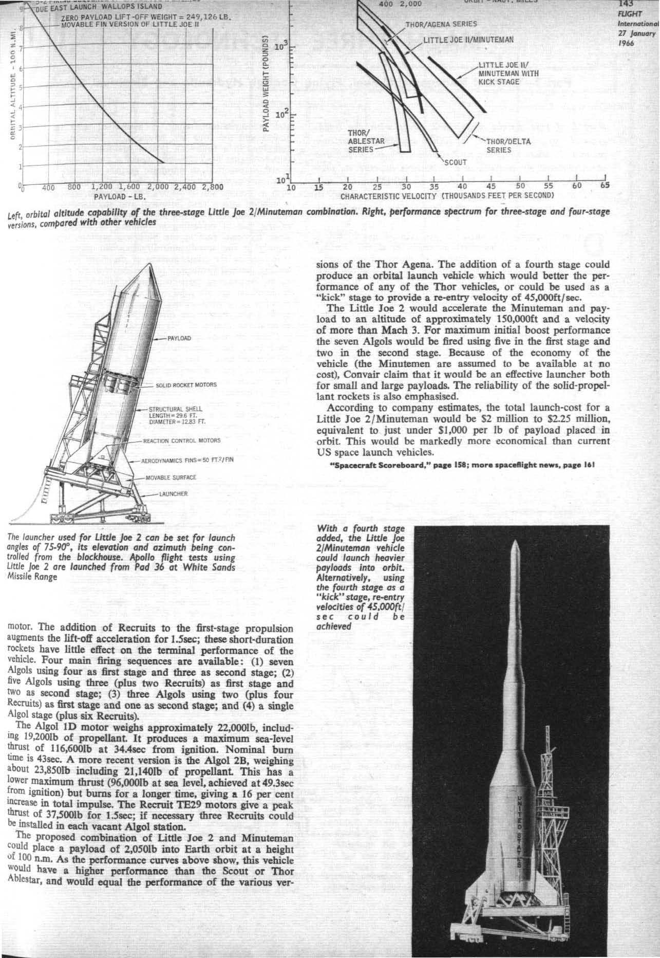 | Other Little Joe-II's Two issues of Flight International Magazine had articles on proposed variants of the Little Joe-II. The first (Dec 2, 1965) was for adding a Minuteman Missile as upper stages to put paylaods in orbit. The page at right was obtained from this web page, second from top. A later article, January 26 1966 (found on this page) covered many of the other proposals. The article does not specifically mention some of the proposals shown in four photos of models, which seem to be sub-orbital. The first seems to be for a very large payload launching version. The second shows a Lunar Module boost version. There is more on that below this page. The third model might be of one to carry a functional Service Module, to do a Service Module Abort test. The fourth model is for testing the X-20/Dyna-Soar abort capabilities during boost. Below, found on the web, a mock-up cut-away Service Module held up on a cylindrical section at the height necessary to clear the nozzle. Had a Little Joe-II been flown with a live SM, it would have needed an adapter ring tall enough to clear the SM nozzle, as seen with this one. ![]() Back to top |