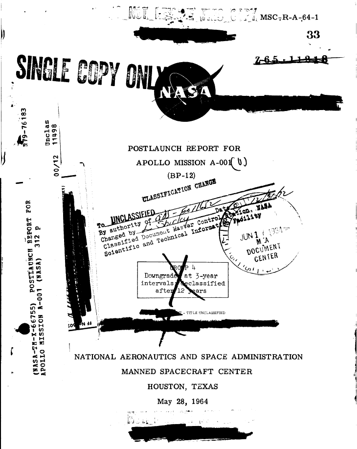 | A-001 / BP-12 Post-Launch Report for Apollo Mission A-001 (BP-12) May 28, 1964 MSC-R-A-64-1 #1979076675 309 page PDF File (68.1 MB) |