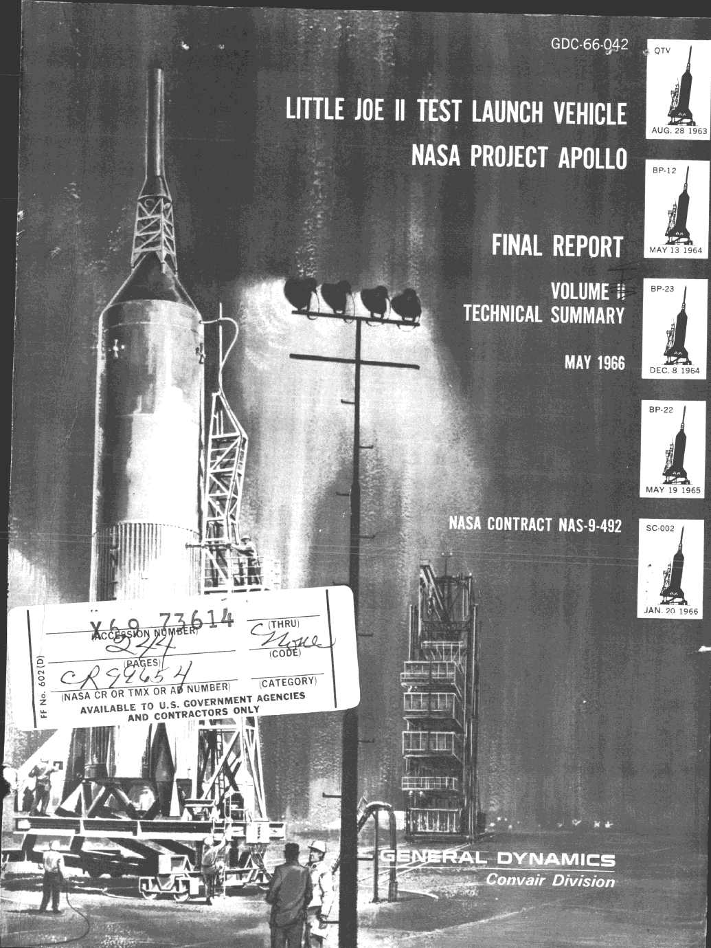 | Little Joe II test launch vehicle NASA Project Apollo. Volume 2 Technical Summary Final Report May 1, 1966 #19690090094 256 page PDF File (215 MB) |