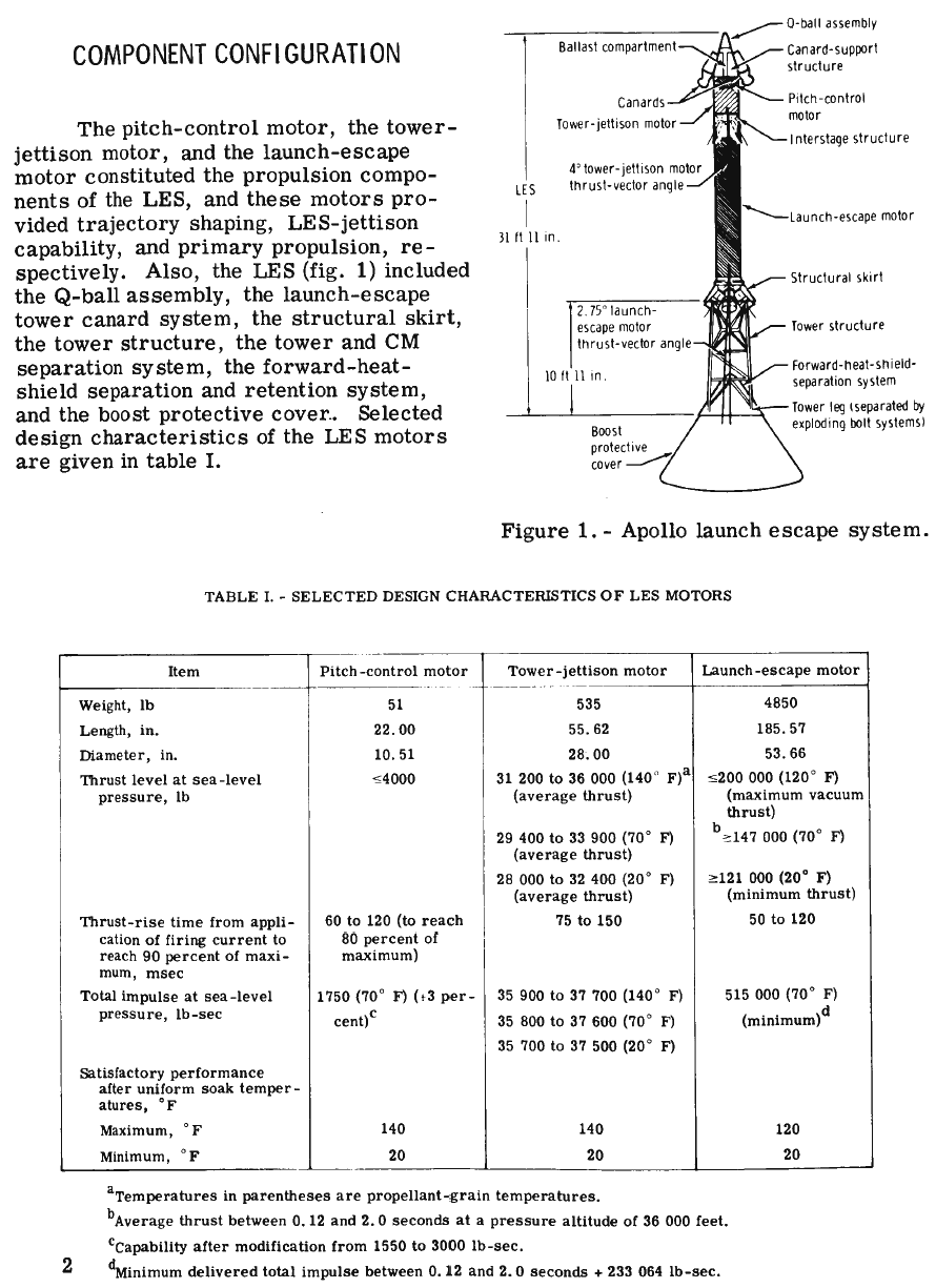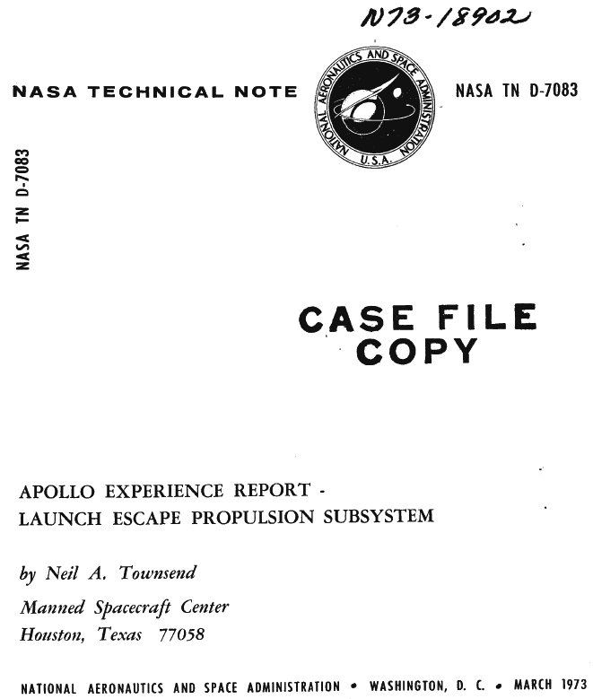 | LES (Launch Escape Subsystem) Apollo experience report: Launch escape propulsion subsystem NASA TN D-7083 Mar 1, 1973 #1973010175 29 page PDF File (1.4 MB) |