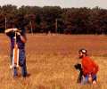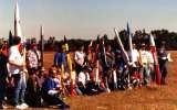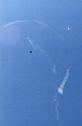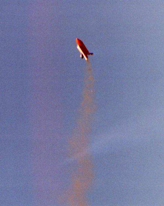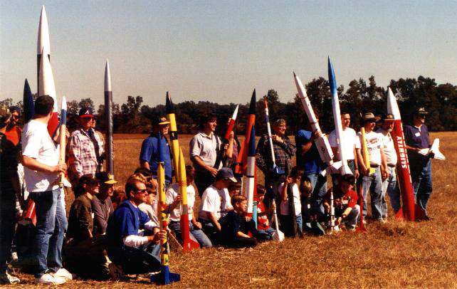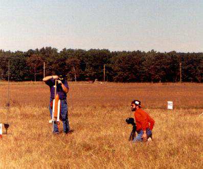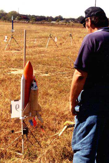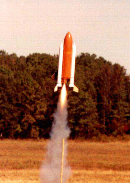 Here are pictures of Boilerplate test flights the Rocket City Blastoff held by HARA on October 24th/25th, 1998. The flights were videotaped by Greg Warren. Pictures courtesy of Ronny and Greg Tipps of Waverly, Tennessee. Thanks! Click on thumbnails to see larger version, otherwise use return or back browser button to return here. The boilerplate had made several good tests at a Team Practice in Muncie, IN, a few weeks before. However, attempts to do "staging" with an A3 failed, with the A3 misfiring. At the blast Off Weekend, the A3 "staging/ was successful in three of the four flights it was tried. There was one wild boost, when an SRB aft attach point was not hooked up right in prepping, allowing the SRB to wobble on boost. The orbiter was purposely sepped early via R/C at burnout, and the Flight Computer programming made the ET ejection fire one second later, as planned. This "R/C Abort" allowed the ET and SRB's to all have time to deploy their chutes, so the whole model landed safely. Except for the mistake in not making sure the SRB's were fully attached during prep, the five otherwise successful flights of that weekend proved that the overall system was reliable. The flight Computer worked right every time, as did the ejection and deployment of the parachute systems. Therefore, those flights confirmed the 1998 boilerplate was reliable, and a serious scale model for contest flying could finally be built. Due to the extra mass and complexity for a model that would be on the edge of 1500 grams, and for the fact the orbiter would not glide if the A3 "OMS burn staging" motor did not ignite (unburned propellant mass in back), it was decided not to built the contest model to have the A3 staging capability. | |