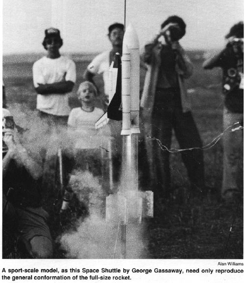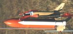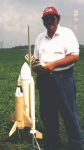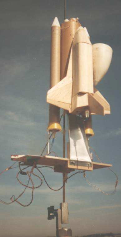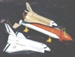 | This model used an F14 in the ET, but the SRB's had token 13mm A motors in them for cluster points and to eject the SRB chutes. SRB's also sepped, via R/C command (orbiter itself was NOT R/C). Unfortunately, cluster problems arose. Some flights, one or both SRB's did not ignite, allowing them to fall to the ground with no chute ejection. And one flight was a total disaster when the A's lit, but the F14 took awhile. The A's took it up the rod, then it fell down, damaged an aft SRB attachment, then the F14 finally ignited, taking off with one SRB wiggling, going wild and crashing. Also, it never achieved the goal of finding out if the ET /Orbiter was stable after SRB sep. Every time the SRB's did sep the orbiter came off of the ET (had angled hook attachments, not latches as with the R/C orbiters) |