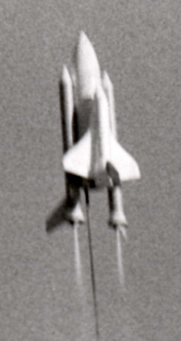 | Shown here is when, after losing control and crashing with mixed elevon control, a temporary nose was added to test out the use of rudder control for turning. This model got a proper nose added after the rudder test flights proved to work out. Rudder control is the best way to steer the orbiter, with elevons used only for pitch. | Flew nicely on an Aerotech F15, however the first flight shown above went unstable due to poor stability calculations. Later 1984 flights used Estes-style fins sticking out the back of the SRB's. | First and LAST atttempt to power a shuttle with engines in SRB's. One D12 did not light exactly in sync with the other, throwing the model to a 45 degree climb as it left the rod. Did not crash, but a close enough call.