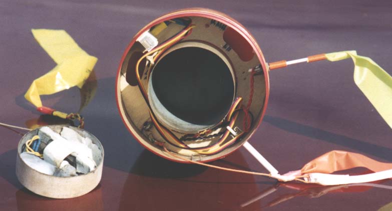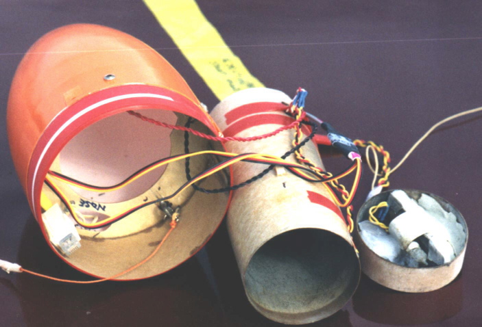 | The BT-80 chute compartment contains a hollow reuseable piston (far right in photo) with the ejection charges inside. The chutes are all stored inside, firing out the rear of the nose. The CG needs to be as forward as possible, but adding dead noseweight is not practical due to the weight limit. So, as many necessary ET parts as possible are located in the ET nose. | |