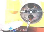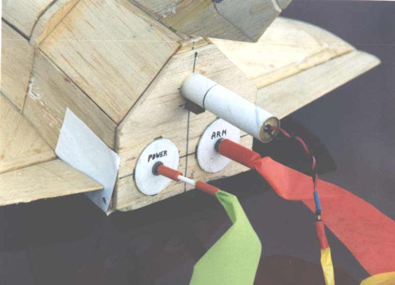 Shuttle_aft.jpg | Orbiter had an engine mount for a 13mm A motor added. Wiring was redone to allow for "remove before flight" style power and arming plugs to be inserted into the positions of the #2 and #3 SSME's. |