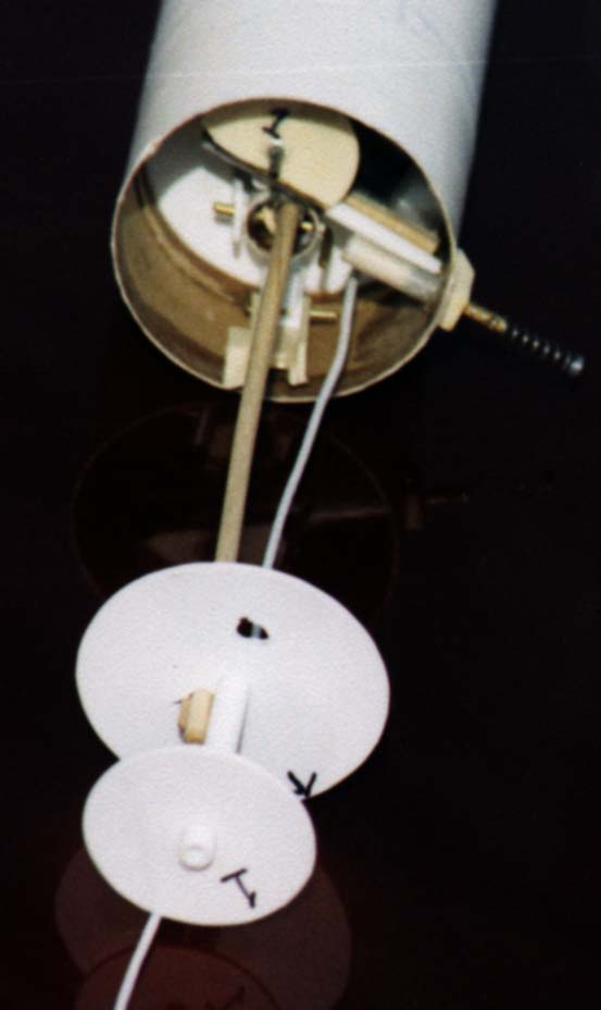 | Photos of the SRB wind-up timers and ejection dowel. When the SRB seps, a restraining rod is pushed out of the way by the timer, allowing it to run. When the disc rotates far enough, a 1/8" dowel is freed, driven up by a rubber band. SRB chutes are stored in the noses, but to assure the chutes come out there is a spool assembly that fits inside the nose. Chutes are not wrapped to the spool, simply fall free when the spool snaps backwards backwards from the nose. |