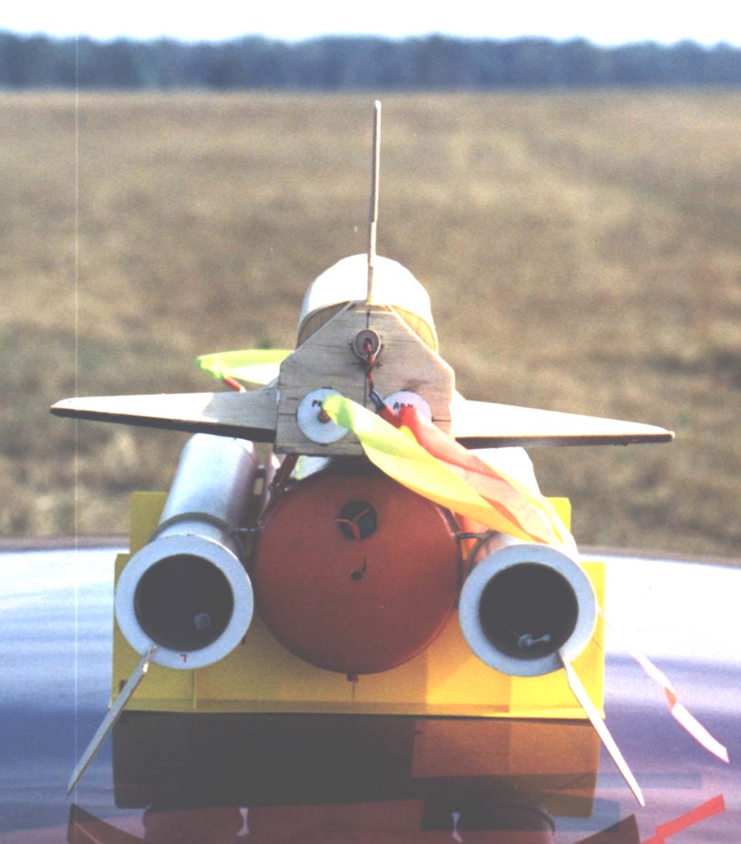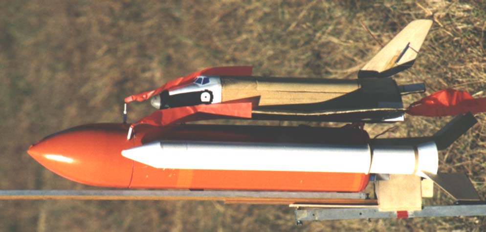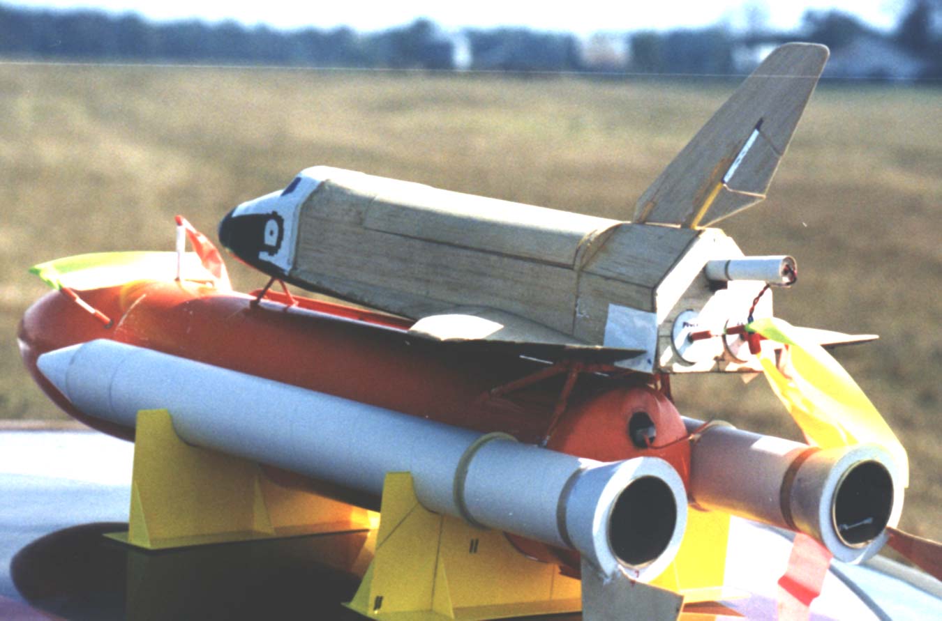 | The old 1982 piggyback orbiter had crashed a few years before, the piggyback booster chute failed and the orbiter did not come off, as it had no R/C sep. Also it had become to costly to fly on F15 motors. The 1992 orbiter solved those shortcomings, with R/C sep at any time and reasonable motor cost. | Piggyback_1_60.JPG | | N-40 Shuttle-1_Vern.jpg | N-40_Shuttle_Launch.jpg |