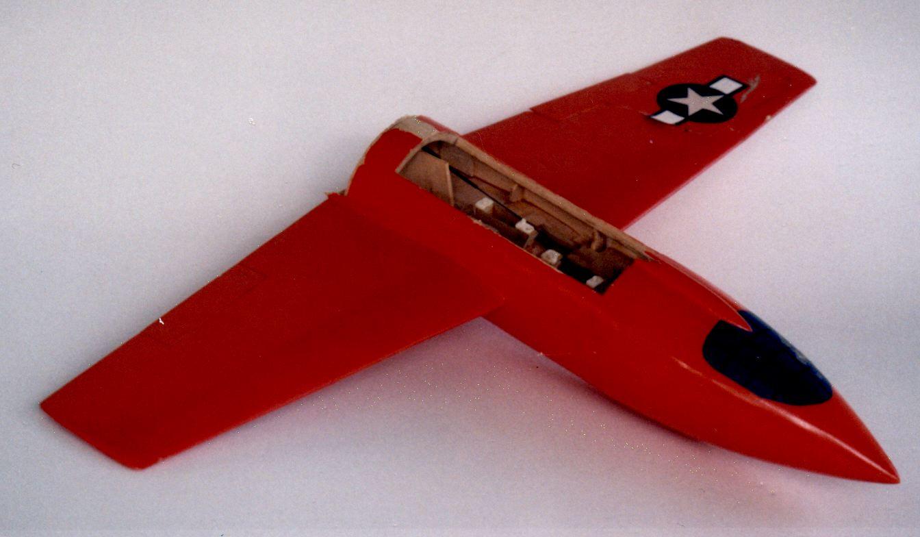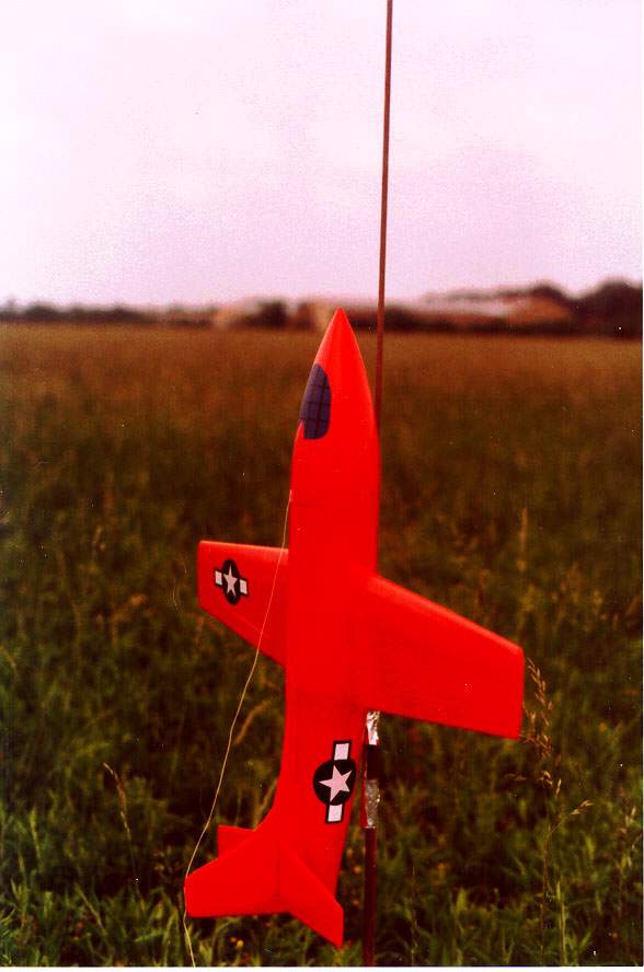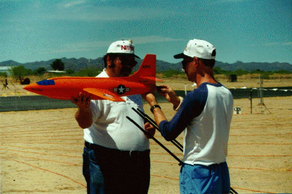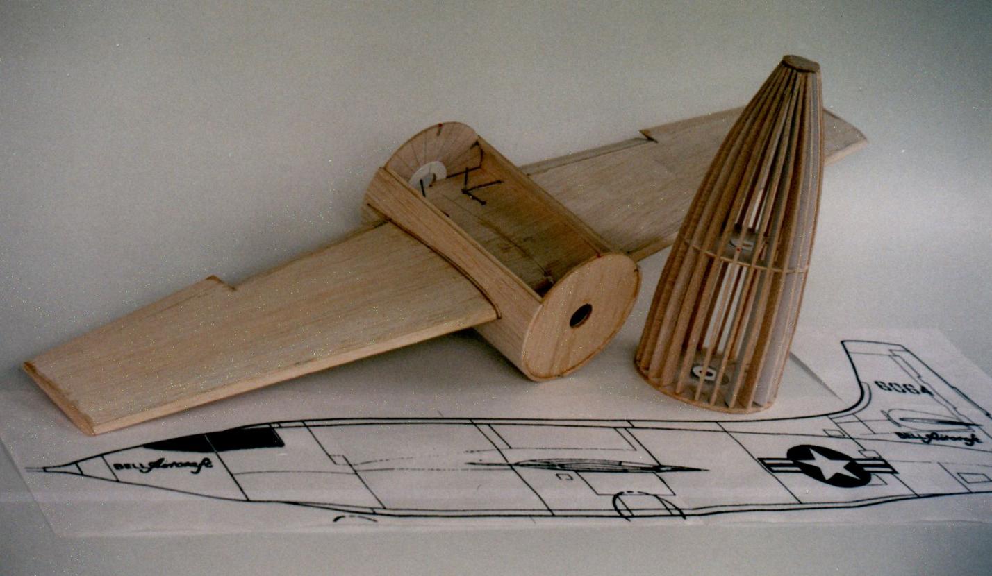 | What follows is a description of the building and the flying of the model. See also the assembly drawing which is on this web page and the pictures of the nose assembly and fuselage subassemblies above. The X-1 model has a scale factor of 1/10. Diameter of 5.4", length of 37", span of 36", Wings just a bit bigger than scale, for a wing area around 165 sq in (150 would have been scale). All-wood construction. Nose section built-up using round formers and 24 stringers, with 24 3/16" balsa "planks" glued across the stringers. The 24-facet cross-section was sanded to a round cross-section. Center fuselage also built up, but a very simple frame with bulkheads, skinned by 1/8" balsa curled to shape. Rear section was a straight cone made up of 3/32" balsa curled similar to how paper & cardboard transitions are made. Some 3/16" balsa was glued inside the lip of the slightly oversized large end of the tailcone so when sanded down there was a 2" curved transition instead of a sharp break. Not quite the right rear fuselage shape, but practical and light. Wing was also based on balsa construction, with 1/16" wing skins, and using a Bob Parks BP-3d airfoil. The wing had a 5.75" span center section that glued into the fuselage mid-section, the outer panels of the wing plugging into the center section using telescoping fiberglass tube joiners and music wire alignment pins. Wing control surfaces consist of what were flaps on the real X-1 (going out about half-span from the root). On the model, those flaps were used as flaperons, moving both as flaps and as ailerons. More recently the flap capability has been taken out, they act only as ailerons. The horizontal tail section was built to be all-moving, a "flying tail". That simplified making the tail removeable for transport, slipping the two halves and their joiner rods from the bellcrank inside thehollow fin/rudder assembly. Power by 32mm reloadable motor, as used by the Aerotech "Phoenix" Rocket Boosted Glider. For G12 and F13 power. Might do an F16J someday but the endburners are more my speed. The burnoff of the propellant would cause a VERY significant shift in the CG due to the far aft locaiton. To compensate for this, a vac-formed water ballast tank was added as far up front as possible. It held 90 grams of water. With a fill/drain line and a vent line. At liftoff the drain line came unplugged to allow the water to drain out by gravity-feed. Tank is fully drained about 4-6 seconds into positive-G glide after a G12 reload. Final details of the model were that the upper and lower ventral system tunnels were made out of vac-formed plastic. The finish of the model was primarily by using orange Towerkote iron-on covering. The lower ventral tunnel was painted using a color-matched paint by Monokote. I wish I'd painted the upper tunnel too, as the Towerkote produced some bubbles that would not go away. The big Stars & Bars markings were mostly cut-out trim monokote, plus some red decal stripes that Ed Lacroix added. The decals for "Glamorous Glennis", "Bell Aircraft", and a few other markings were done in MacDraw (much traced from scans of X-1 kit decals Alex Seltsikas did for me) and color printed. The color print then was used as a master in a color xerox machine to print onto some high quality clear water-decal film tom Campbell gave me info on (From Micro-Mark). Obtaining the decal material and printing them was described in more detail earlier this week in the thread about how to make decals. The model's mass turned out to be around 30 ounces in liftoff mode on a G12, 25 ounces for glide (5 ounces lost by water dump and propellant burnoff). Now, when I planned building this a few months ago, it was going to be "for fun", to sport fly at NARAM. But part of the way through building it, I started to think about entering it in sport scale at NARAM. It actually was a dumb thing to do if our team wanted to score well, the Little Joe II has a good track record, while the X-1 would not score well in static. But in helping to run NARAM this year, our team wasn't flying as "seriously" as we usually do. Ed LaCroix agreed it seemed like a neat thing to do this year, so we decided to use that for Southern Neutron's sport scale model after all. Indeed it didn't score up there in static, 5th place. On to the flying. Ed LaCroix assisted getting the bird ready to fly from the tower, as we loaded the water ballast, plugged in the battery pack, and popped the canopy in place. At launch it took off out of the tower straight. But it had a bit more up trim than it should have, it pitched up near vertical and I had to use full down to keep it from going beyond vertical onto its back. It also had a roll that I let go while working the pitch control . Finally settled down into a glide, as it stalled somewhat due to the trim still being off. Got it sort of trimmed, and also trimmed out a roll to one side. Finally ready to land, trying to land on a real dirt runway at the NARAM site. Coming in just fine, then put the flaps down and... it pulled to the left. The flaps didn't deploy symmetrically. Landed safely, but missed the runway. OK, so it was planned to be one flight. But that flight wasn't satisfying. So, quickly it was ready to fly again. This time with downtrim added, and aileron throw reduced (it had been sensitive in roll on glide). The launch was very smooth, as though on rails. Pulled a bit of up to bring the final climb angle ot around 60 degrees, and corrected a bit of roll. So it was a very smooth easily controlled boost. Altitude was around 500 feet. Never even felt the difference when the last bit of water ballast drained out, it felt good in glide off the bat. Still a bit sensitive still in roll during glide, so I went back to the boost low rate for aileron throw. Did at least one very large racetrack pattern, maybe two, before going to the far end of the runway to set up for landing. Got there with lots of altitude, so did a couple of 360's to burn it off,