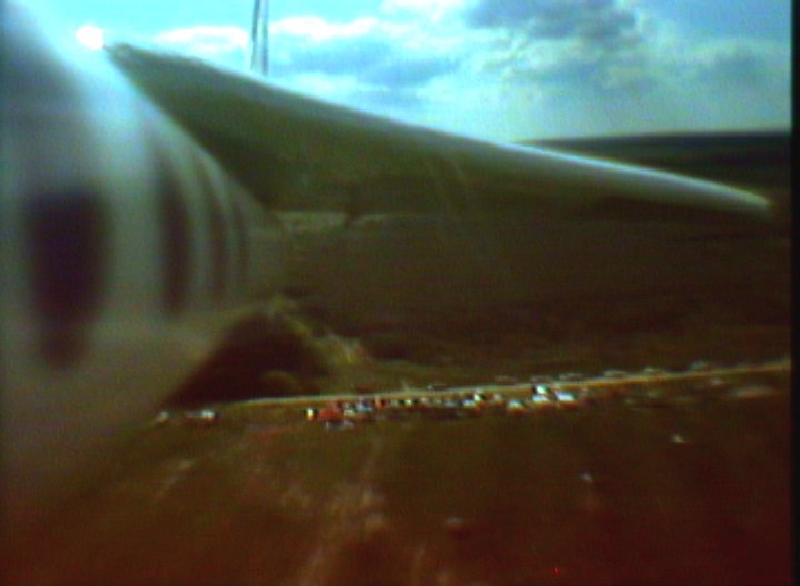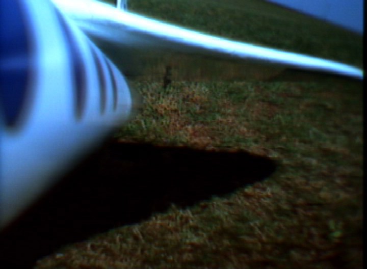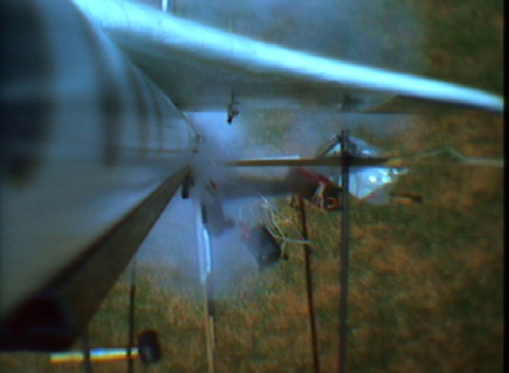 I got to see the last part of the SkyDart as Todd flew it. It wasn't exactly the sort of model he'd flown before but he was adapting to it. His piloting chore was made a lot harder, as it was later found that one of the elevons was moving more than the other elevon (very bad for any delta-wing type model), something happened between its solo flight on Saturday and the Orbital Skydart flight Sunday. At the last moment the model was coming close to the large long wheeled mobile sprinkler assembly (the site was a large sod farm), he tried to avoid it which resulted in them model hitting the ground at an angle. Fortunately there was little damage, mostly cosmetic (It flew solo again at the Birmingham Blast Off on May 21st). Both videos recorded successfully. Though there were some signal dropouts from the SkyDart during glide. The SkyDart pitched up pretty fast when it separated, so neither model's camera saw the other model for long, just enough for a frame grab. From the SkyDart's camera, it was seen that the model rolled quite a lot during the boost, it was supposed to be well-trimmed based on an E6 flight the SkyDart made by itself on Saturday, but something happened from then to Sunday'sOrbital SkyDart flight. In the SkyBooster video, looking forward, the two right side launch tower rails can be seen, especially the one nestled between the top of the wing and the body tube. The little green flag seen flapping around is attached to a "stopper" on a piece of surgical tubing which is used for filling the water ballast tank. The stopper and tubing are attached to an external umbilical on the tower assembly, which disengages at liftoff to let the water start dumping out (the water in the nose is to compensate for the propellant mass of the two G12's. See the X-1 page for more info on the water ballast method). This photo and this photo from the Orbital SkyDart Project page shows more on the water umbilical A surprise seen in both videos, especially the SkyBooster's, is how the water ballast that is dumped from liftoff, flowed onto the top of the wing and part of the body tube. The dump port is at the "bottom" of the nose cone (glide orientation), but then the wing top is tangent to that side of the tube so maybe it's not such a surprise that much water runs that way. After transition to glide, some of the water can be seen flowing nearly parallel to the leading edge of the highly swept forward portion of the double-delta wing. Also, when the SkyBooster goes into that deep stall,, the airflow noise suddenly gets scarily quiet (considering the airflow noise the rest of the time), then "plop" it lands and skids to a stop. The SkyDart video is 320 x 230 resolution, a 5.4 Quicktime movie The SkyBooster video is 320 x 230 resolution, a 4.3 meg Quicktime movie |