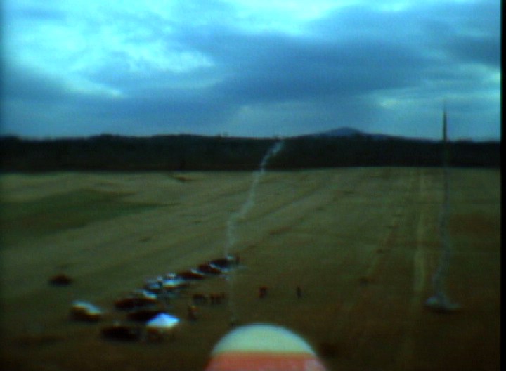 | Flights at the March Birmingham Rocket Boys Launch, at the Phoenix Turf Sod Farm. It was a mostly overcast day, though the sun broke out a few times. The wind was about 5-10 mph. In some scenes an orange tape can be seen along the launch area. That is not a landing "runway" line. It is for the launch area, so pads go on one side and spectators stay on the other side. The Cuda-Flap model's Gearcam video system was upgraded a lot since the February flights. The very draggy mount that pointed the camera upwards, into a rotating mirror, and which also carried a 9 volt battery in the airflow, was replaced by a mount to rotate the camera 180 degrees horizontally. The camera inside is mounted to look a few degrees down rather than perfectly straight back or forward. The rotating pod consists of some modified 29mm tubing, a piece of Centuri #10 tubing (to hold the Gearcam) and a couple of 30mm vac-formed nose cones. One of the cones was painted black inside and out to shield the camera from reflected light. It was triggered by the same sort of retracting pin method as before, driven by the flap servo. I had originally thought of removing the flap servo and putting in some means for a servo to directly (and slowly) rotate the camera pod 180 degrees, but that proved to be far more easily thought up than worth working all the bugs out.