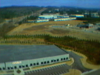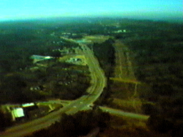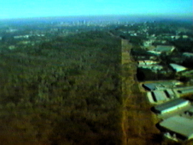 The video frames above were taken at over 1000 feet, the highest flight of the day. The one at the left is looking NorthEast, Downtown Birmingham is visible way off in the distance, over Red Mountain. The photo at the right shows a view looking to the SouthWest (A power line right of way is in both pictures).  Click here for Quicktime movie (900k).