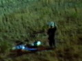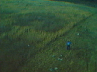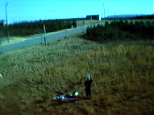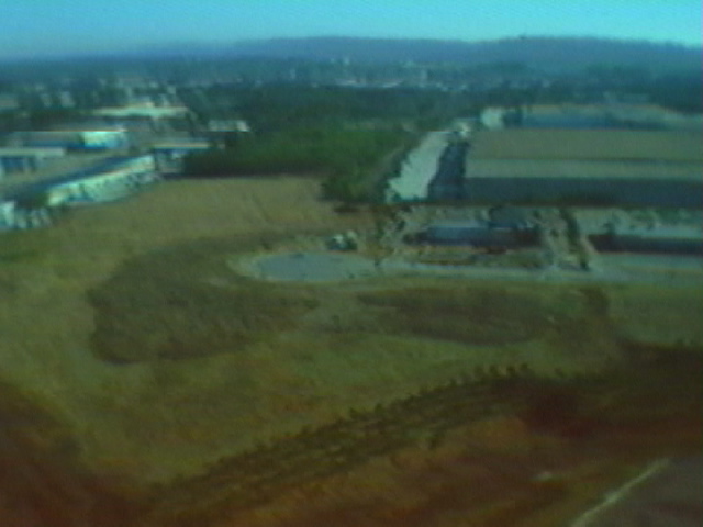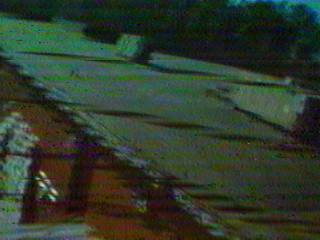 The day ended poorly. The model was flying along at about 400 feet or so when interference problems hit it. The electric motor came on by itself, and the model started to turn and dive by itself (the curved black horizontal dashes in the video and frames are from the spinning propeller, a sort of strobe effect). Came close to getting it to come back, but the interference took over again and made it go down towards a building. I wasn't sure if it went down in front of, behind, or on top of the building. To make a long story short....the videotape proved it was on top of the building (Onboard camera's battery had died by the time I was able to move the receiver/TV gear to the building for a "live" shot). The next day, Ron Witherspoon of the Birmingham Rocket Boys section got it off of the roof, using a ladder arranged by BRB member Steward Jones. Much thanks to Ron and Steward for thgeir help. As the video had indicated, the model had pulled out near the end, hitting a glancing blow and apparently bouncing/skipping for about 20 feet past where it first hit. The only damage was that a control horn had broken off from one of the V-tail surfaces. Click here for Quicktime movie (1.6 meg).