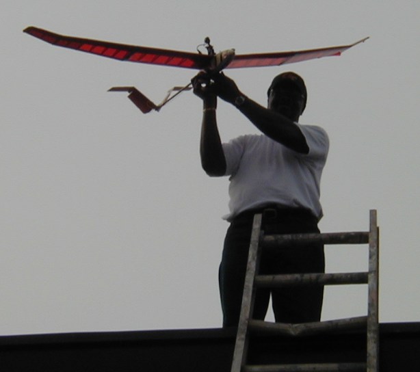 Linked here is a 2.1 meg Quicktime movie clip of the sailplane gliding around (it was a bit windy), finally coming in low, then starting to climb back up (note the horizon angle tilt due to the pitch-up of the climb).